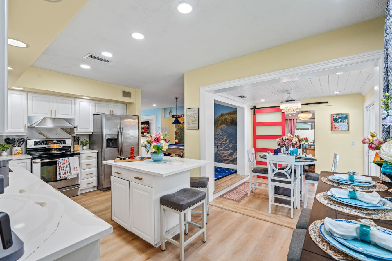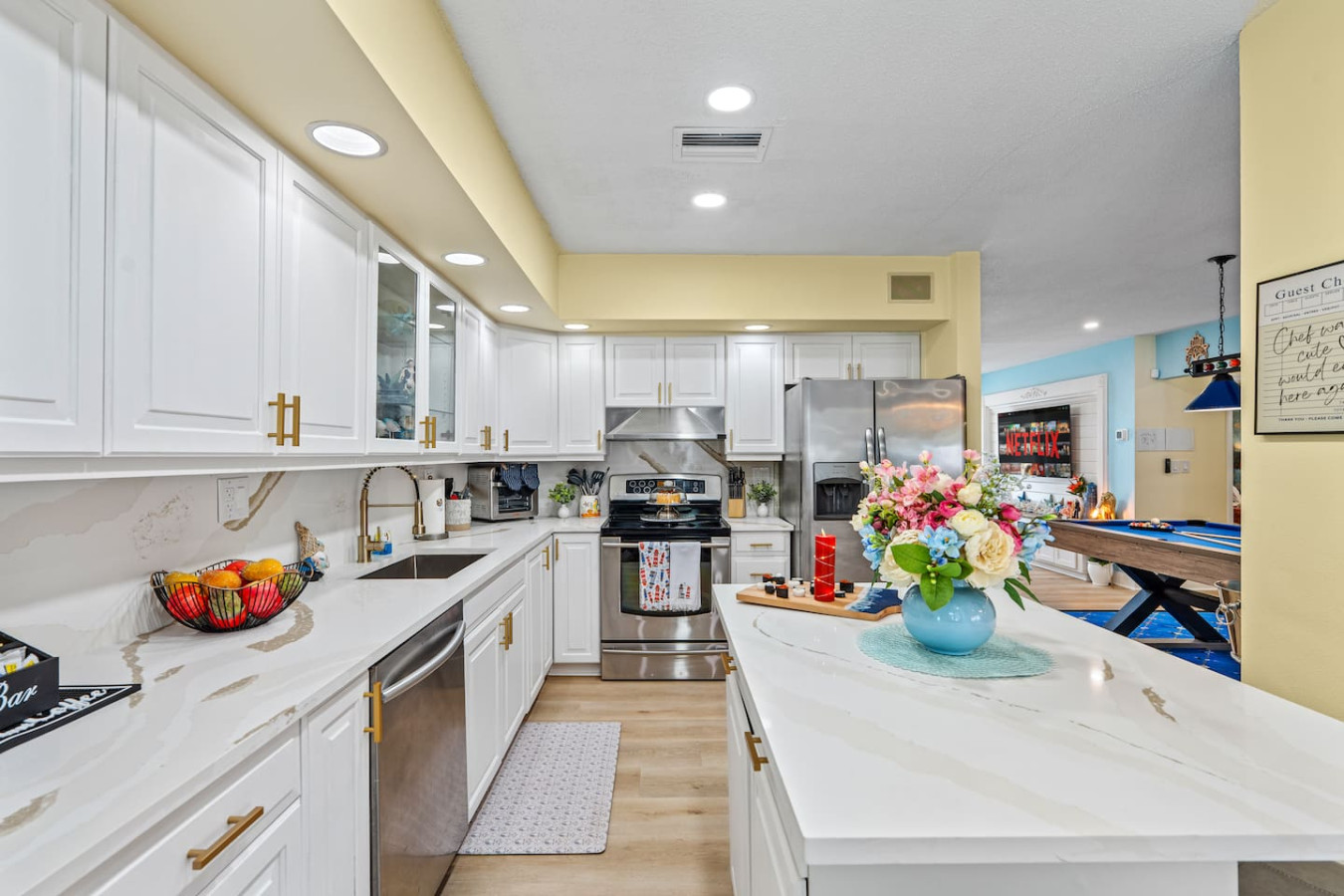 The kitchen is fully stocked for real group cooking β quality cookware, full dish sets, coffee setup, and everything needed for family breakfasts and dinners. A Publix is a 3-minute walk β the most convenient grocery access in the portfolio.