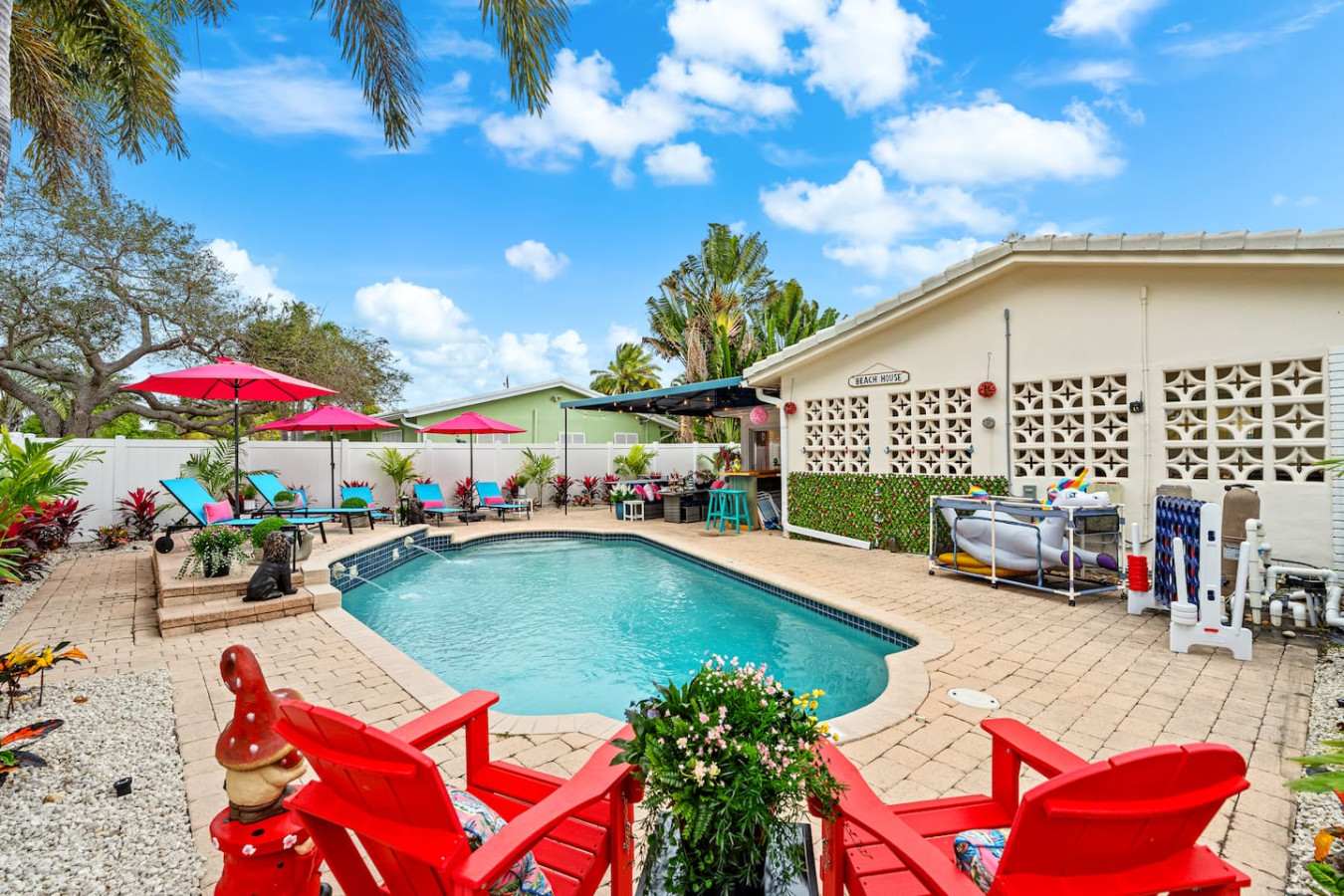 You're on vacation and your host simply wants you to feel it β no punch list, no pressure, just a Lighthouse Point backyard with a heated pool, putting green, covered entertainment area with bar and ping pong, and billiards inside. Publix is a 3-minute walk. Deerfield Beach is 10 minutes. Sleeps 10. Pet-friendly. Trundle beds in three rooms β Perfect for families, bachelorettes, and group getaways. No checkout task list. Beach chairs, umbrellas, and coolers included. Host responds in minutes.