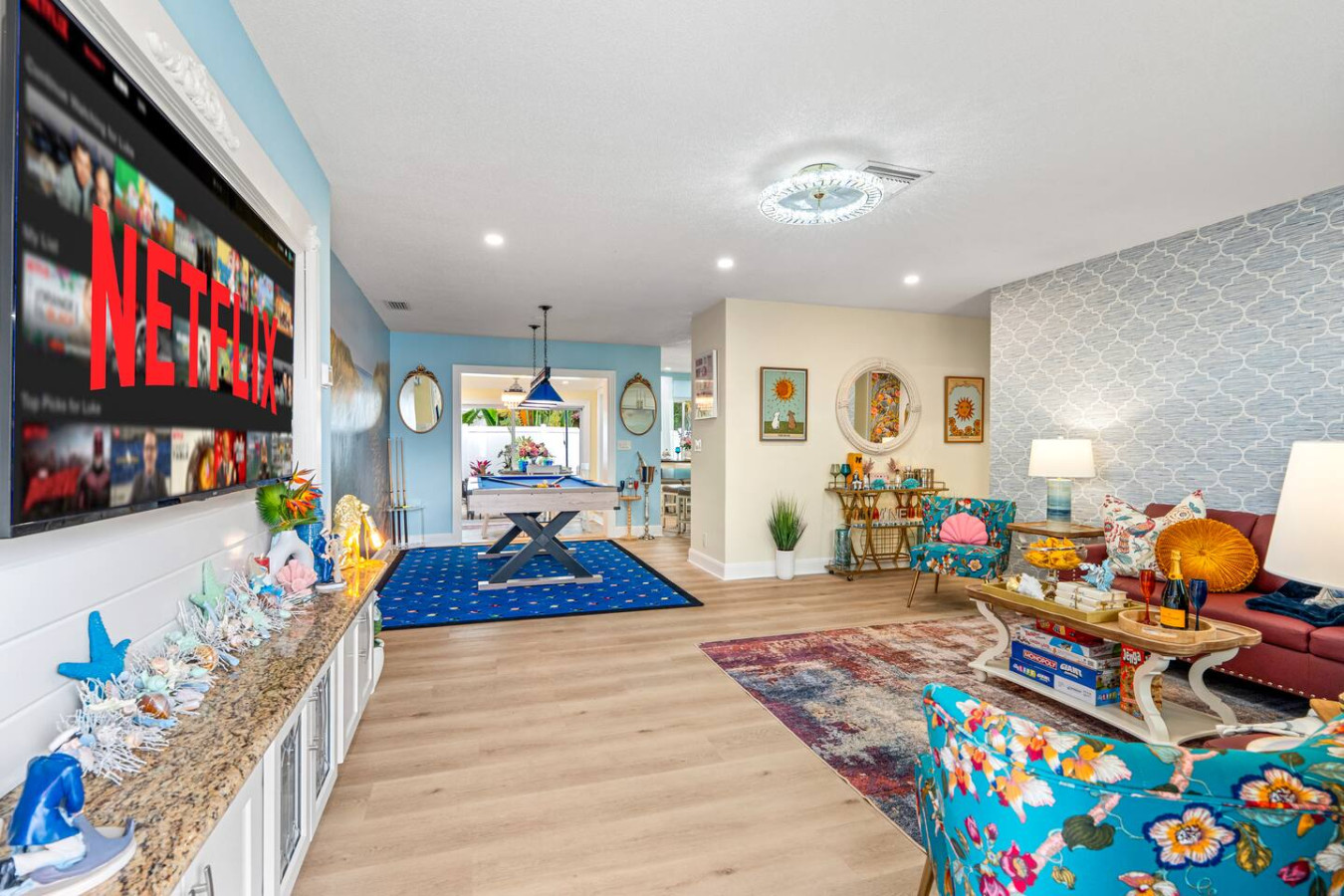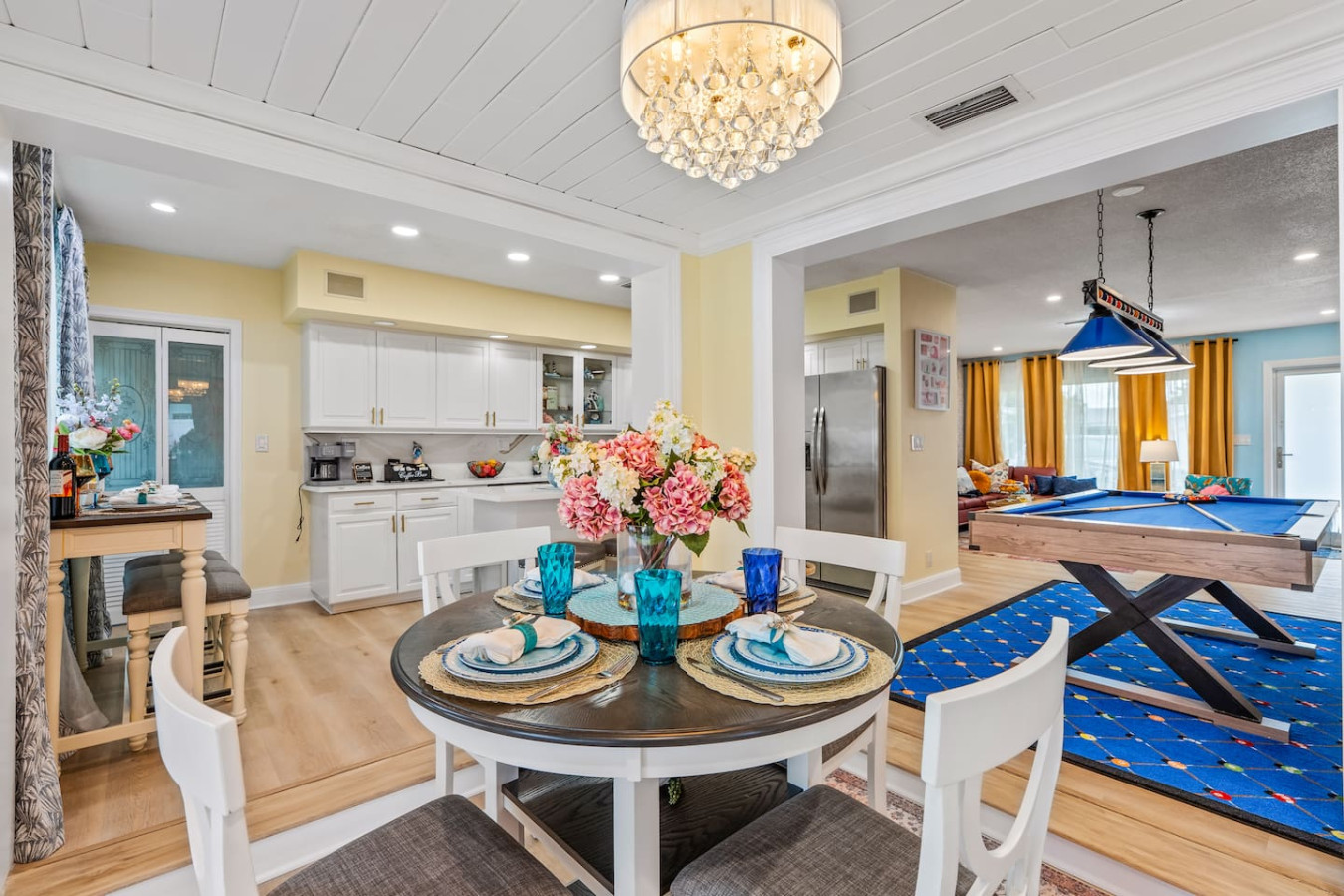The interior is bright, clean, and thoughtfully set up for families and groups. The layout gives everyone their own space while keeping common areas genuinely social. A billiards table anchors the indoor entertainment β between that and the covered outdoor area, groups consistently say they never felt the need to leave.