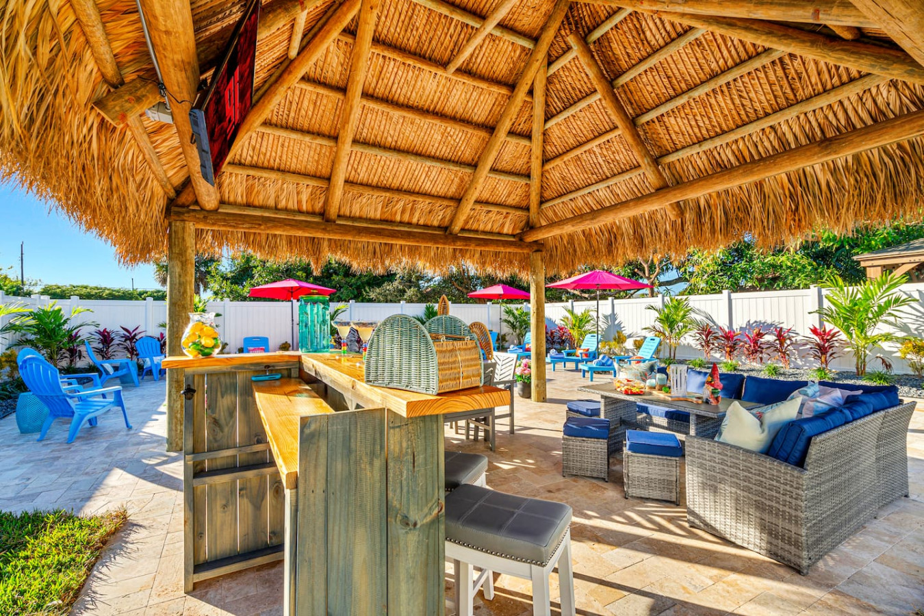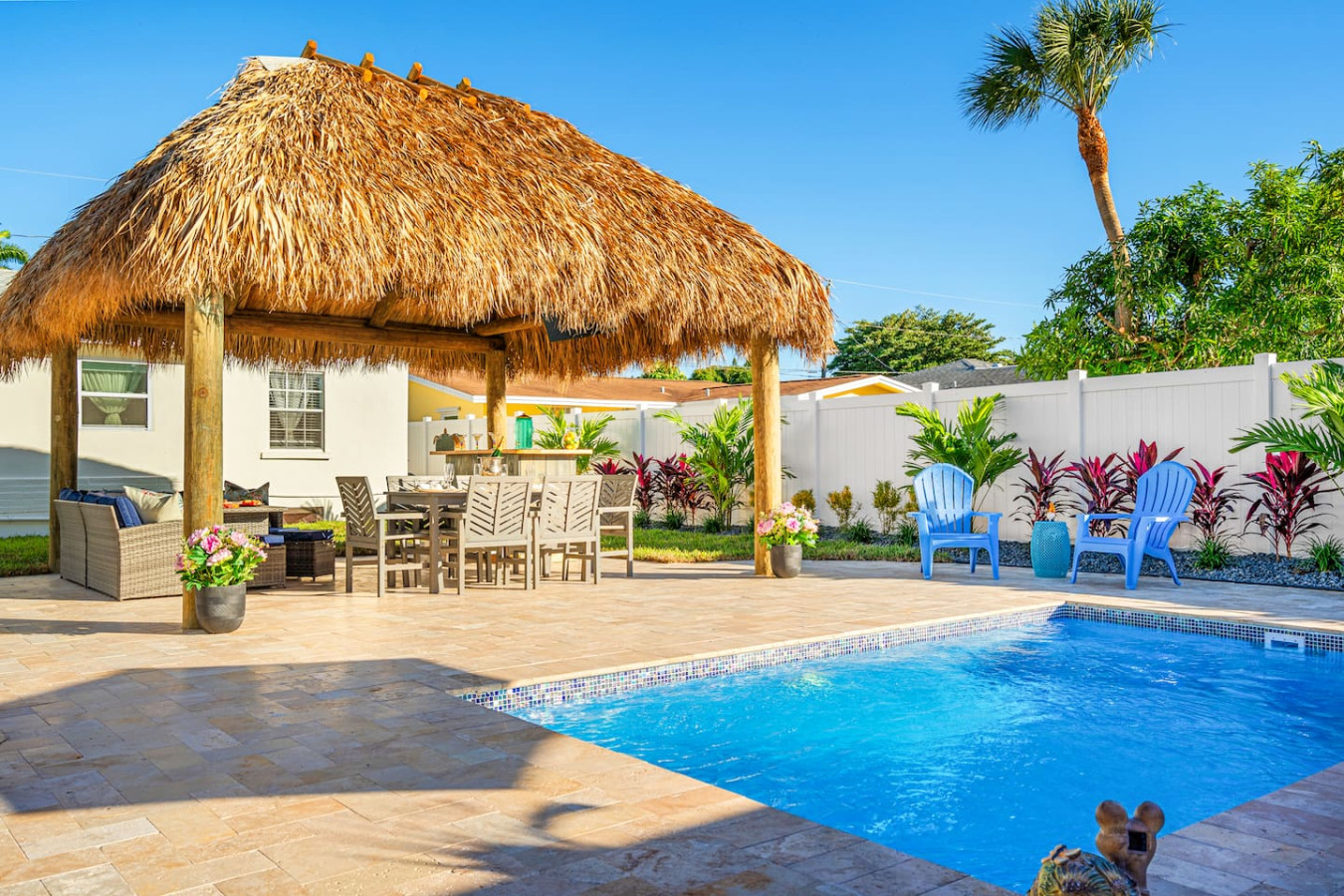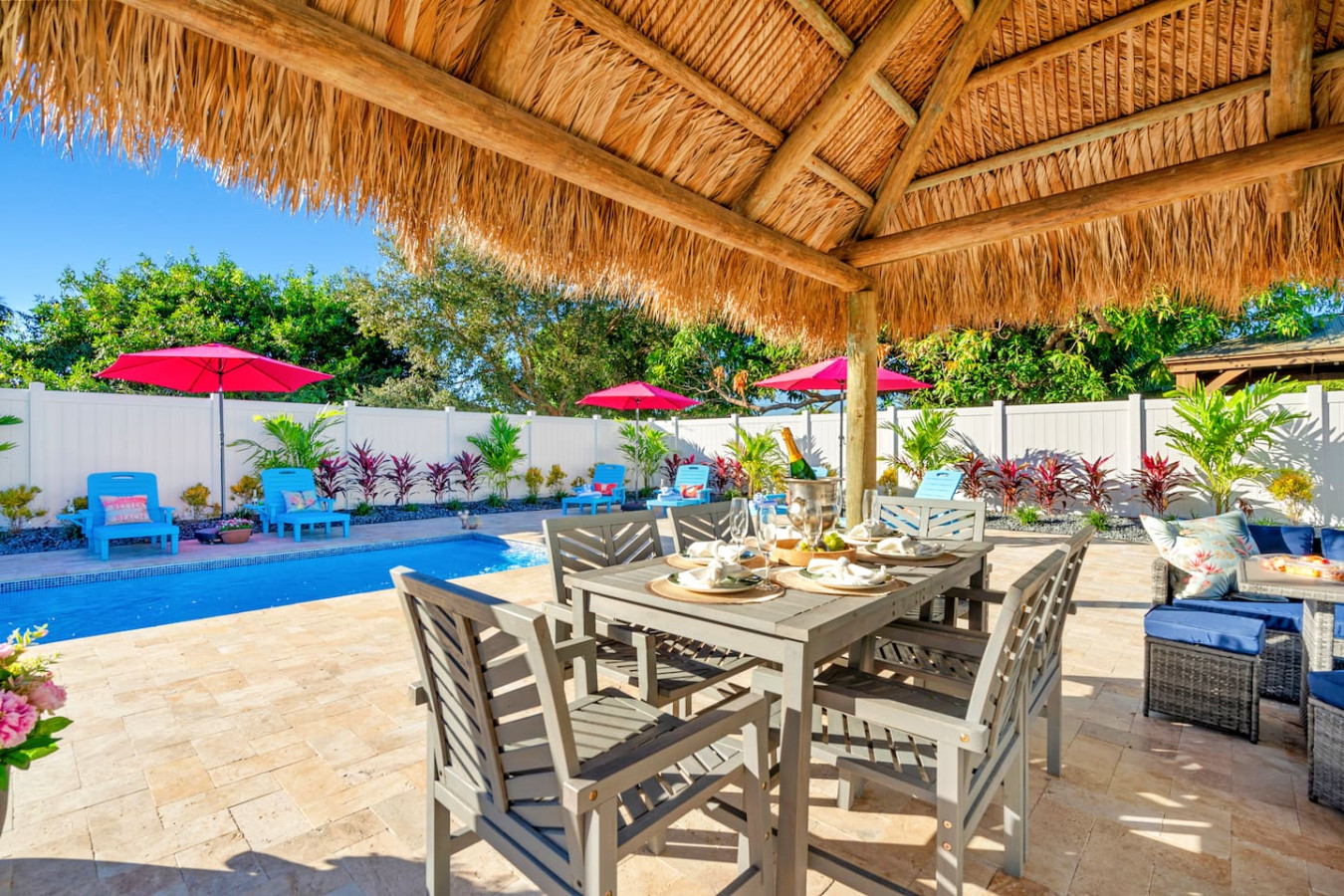 The travertine patio stays cool underfoot even in full Florida sun β making the outdoor space genuinely usable all day. The tiki hut has been the setting for bachelorette dinners, graduation celebrations, girls movie nights, and morning coffee sessions. One group barely went inside for five days.