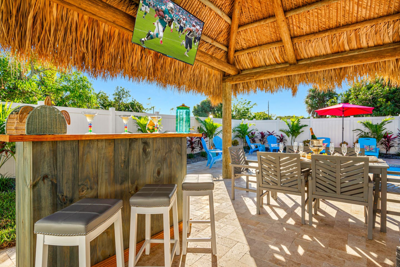 Tiki hut. Heated plunge pool. Travertine patio that stays cool underfoot. Cornhole. Grill. And a FreeBee shuttle that picks up right at the front door and drops you on Atlantic Ave. This is the Delray bachelorette house. Sleeps 8. Walkable to Atlantic Ave. Pet-friendly. No checkout task list. Bar cart with martini and wine glasses ready on arrival. Beach chairs, umbrellas, and coolers included. Perfect for bachelorettes, birthdays, and girls trips. Host responds in minutes.