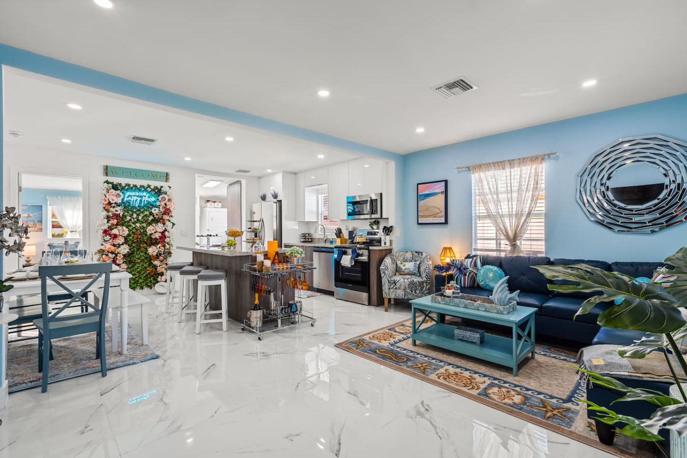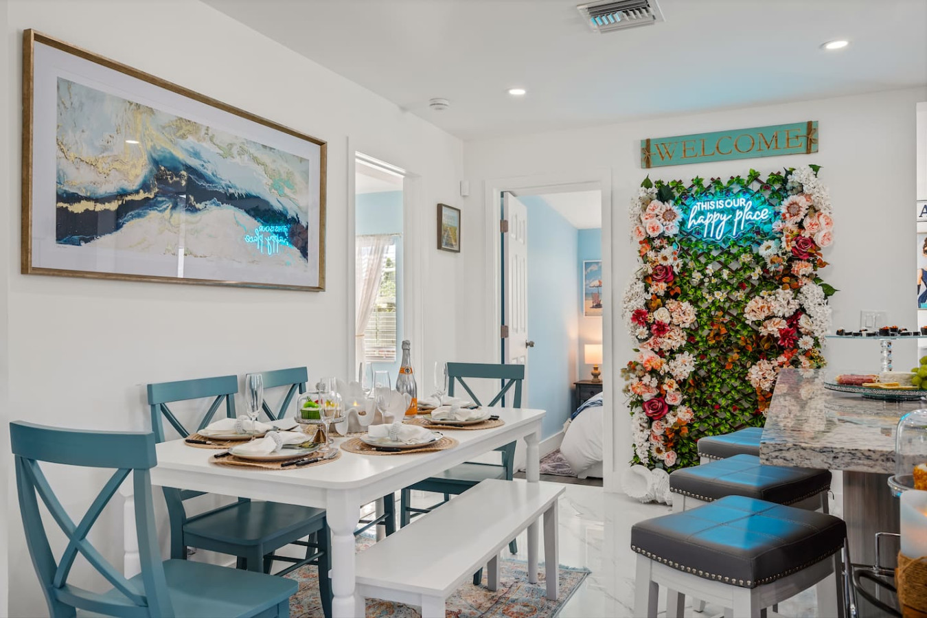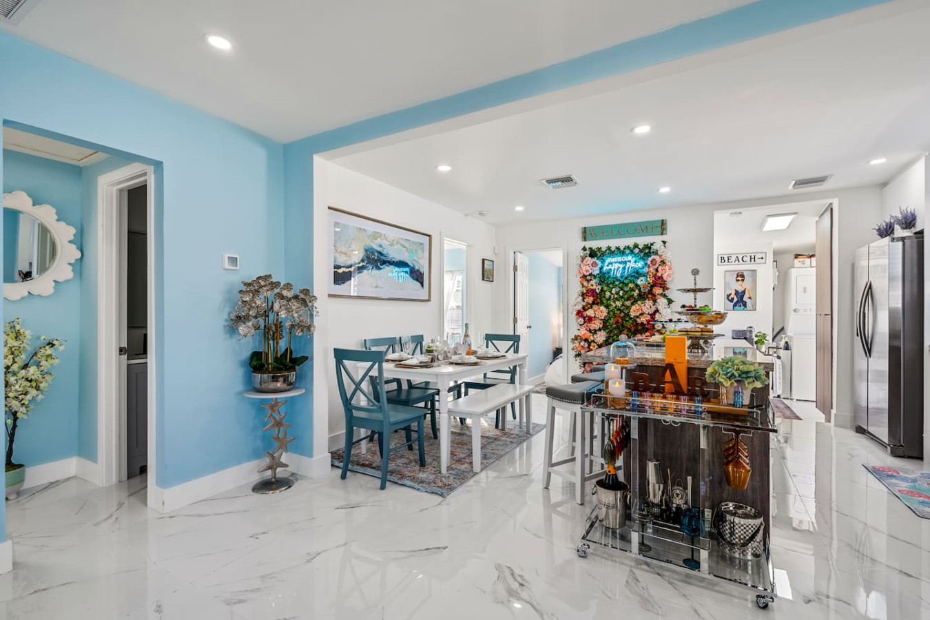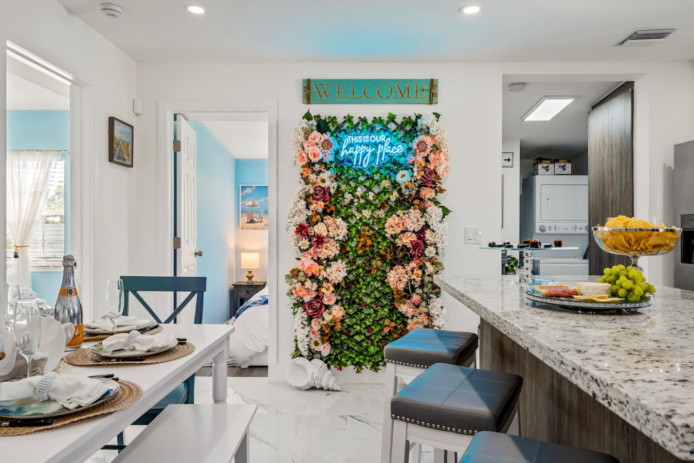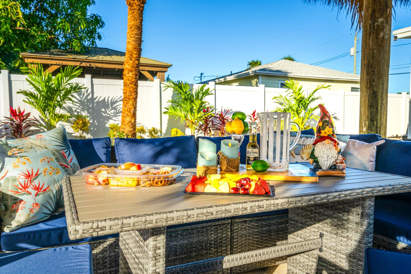 The backyard is fully private and enclosed β a genuine tropical escape in the middle of Delray Beach. Cornhole and oversized Connect Four are set up and ready. A BBQ grill and outdoor dining round out the setup. A fully stocked bar cart with martini and wine glasses is ready when you arrive.
