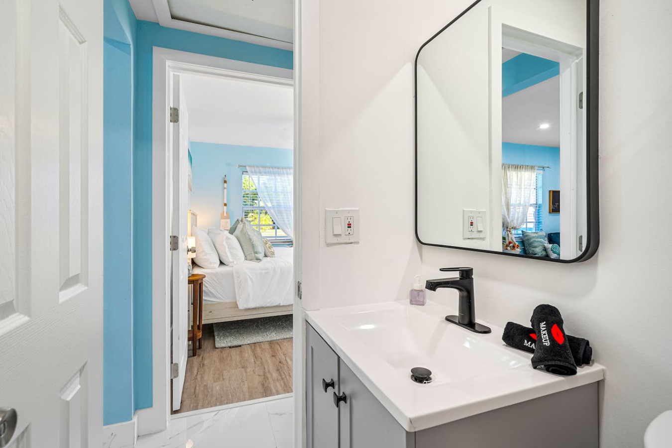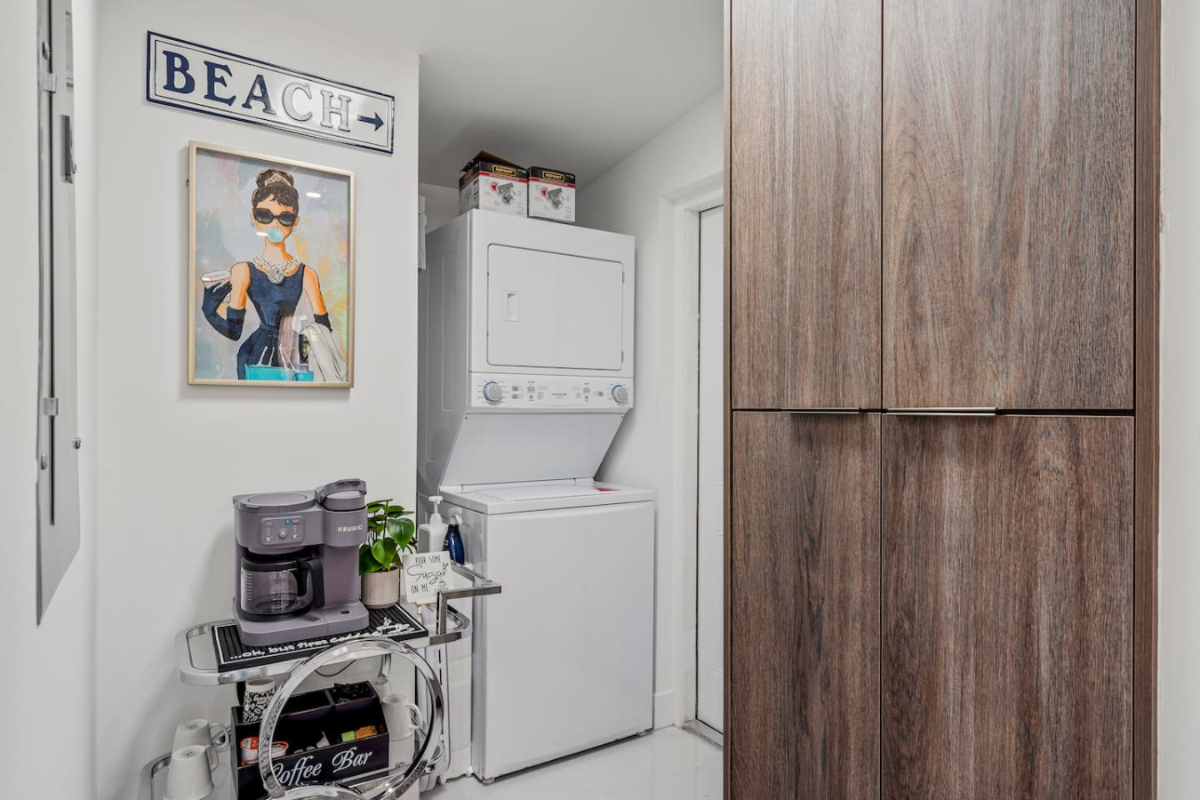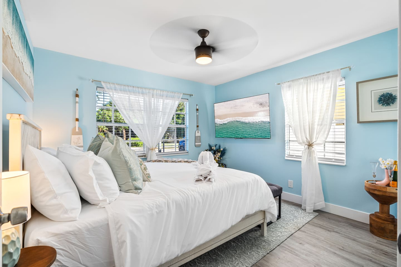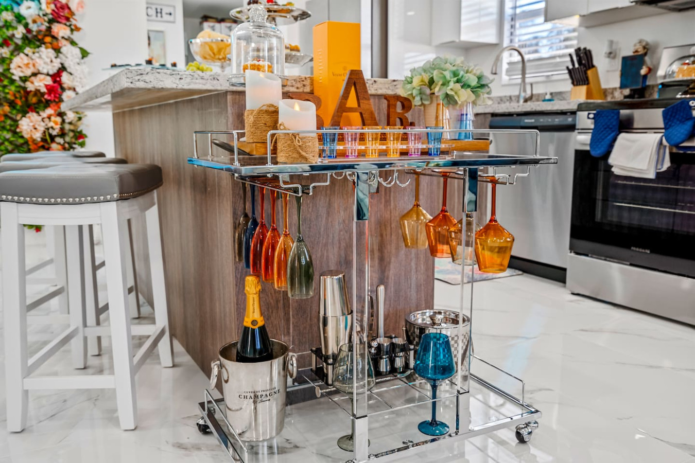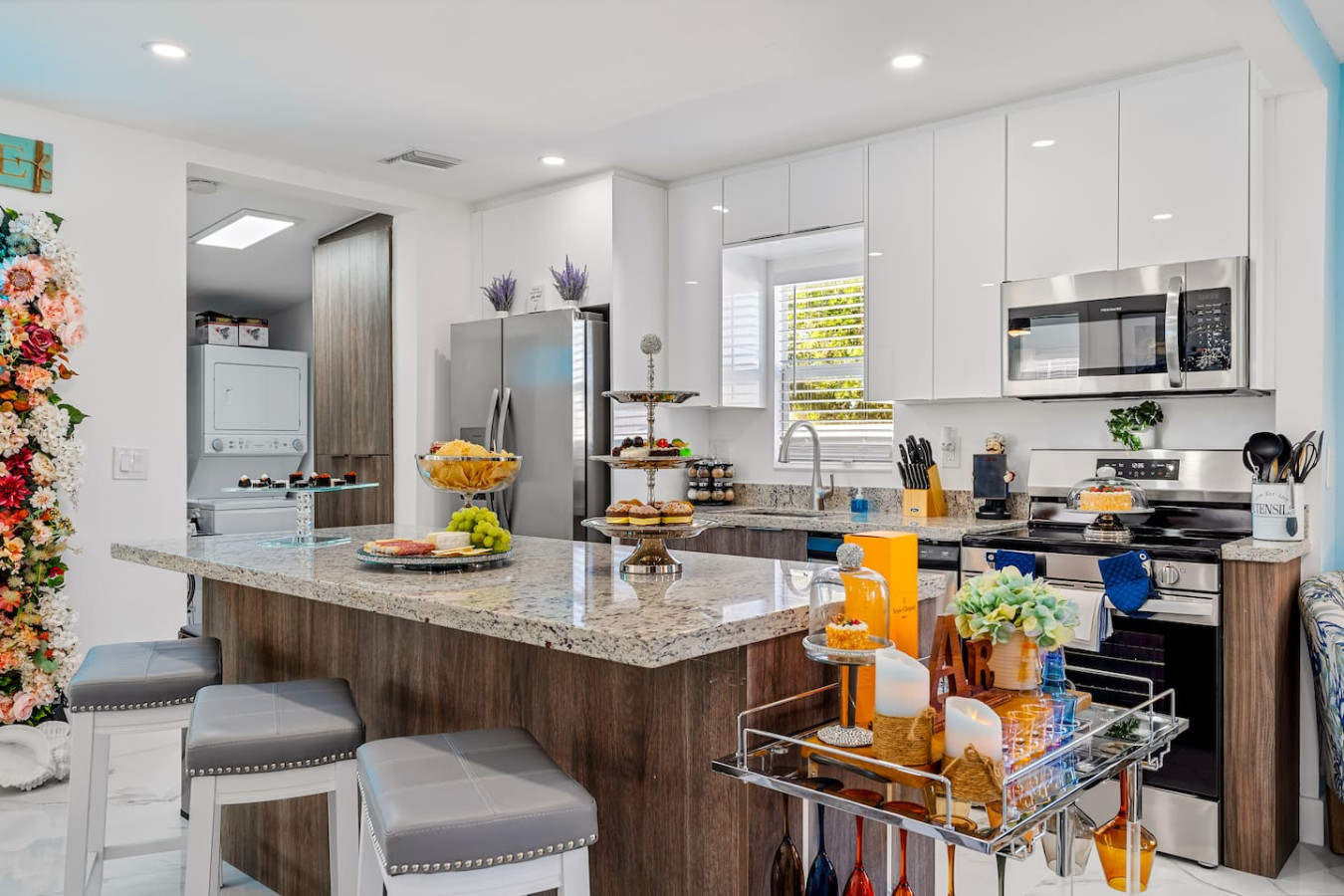 The backyard is fully private and enclosed β a genuine tropical escape in the middle of Delray Beach. Cornhole and oversized Connect Four are set up and ready. A BBQ grill and outdoor dining round out the setup. A fully stocked bar cart with martini and wine glasses is ready when you arrive.