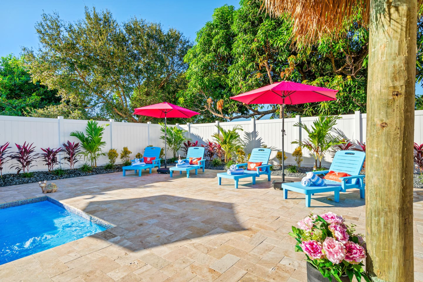 The pool is a plunge pool β designed for cooling off and relaxing, not swimming laps. It's the right size for the backyard and the right size for the way guests use it. Multiple guests have called it perfect after a long beach day. If you're expecting a resort-scale pool, this isn't it β if you want a heated pool in a private tropical backyard, it delivers every time.