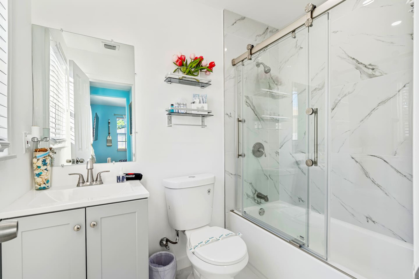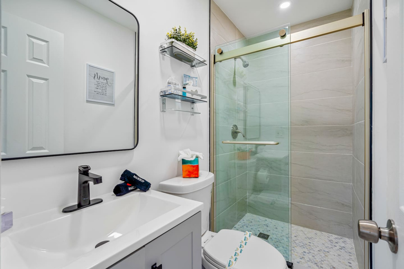 Both bathrooms are updated β walk-in shower in one, bathtub and shower combination in the other. Fresh towels, hair dryer, and essential toiletries stocked throughout.