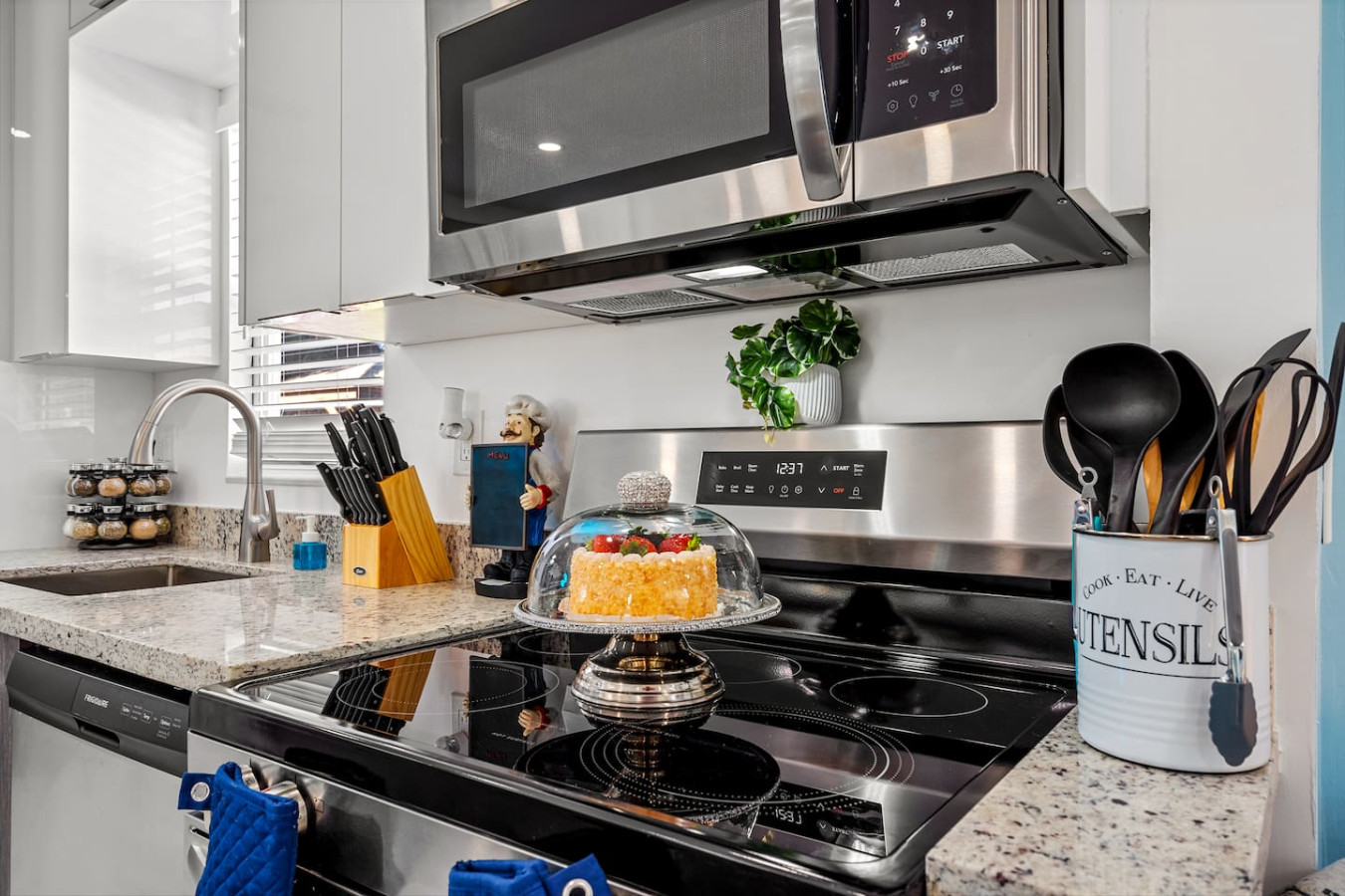 The kitchen is fully loaded β quality cookware, full dish sets, stocked coffee bar, dining table for six, and kitchen island seating for three. Everything needed for real group meals without a single missing item.