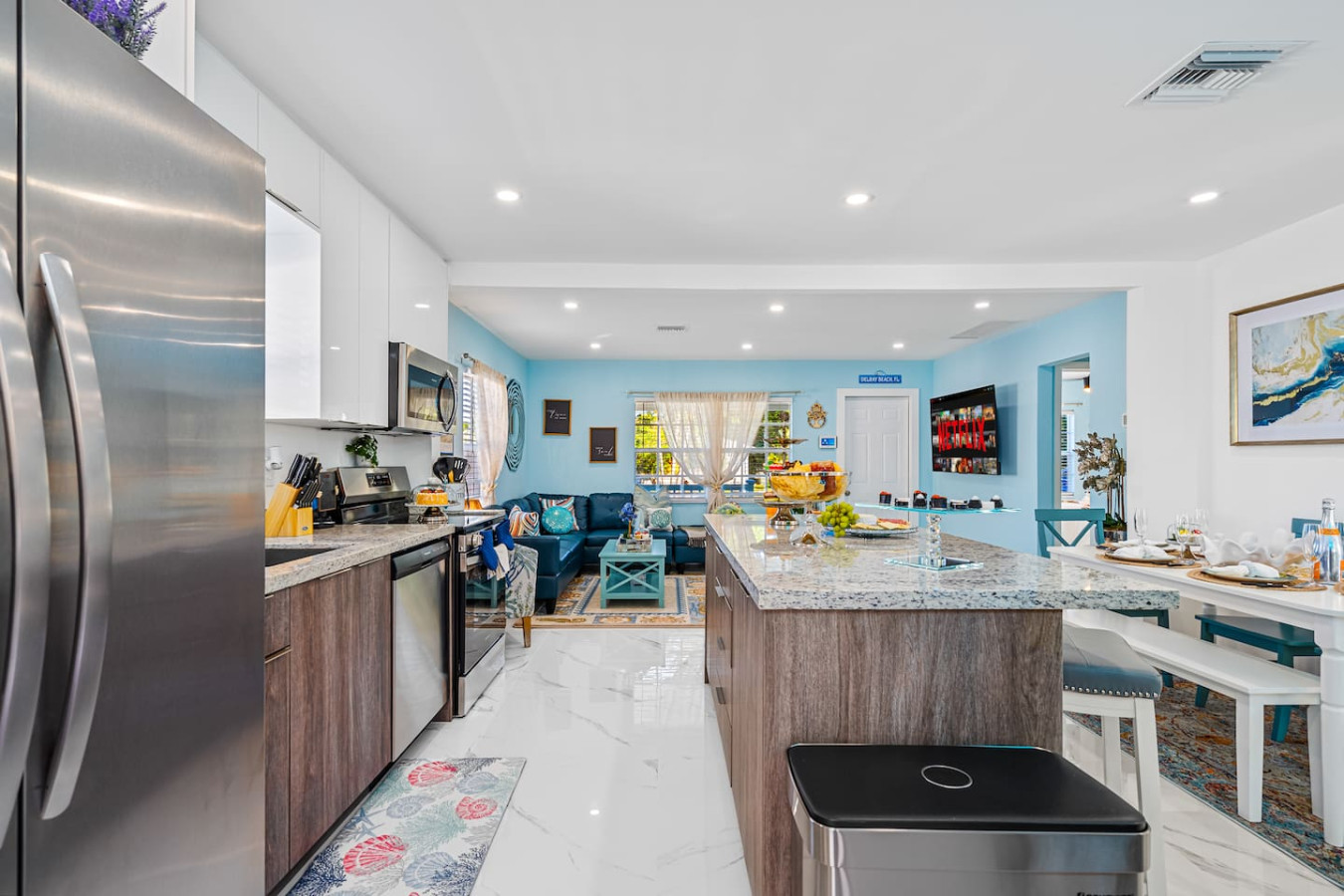 The interior is bright, well-decorated, and thoughtfully stocked β guests consistently describe it as cozy and inviting. This is not a large house. Three bedrooms, two bathrooms, and a comfortable open-concept kitchen and living area designed for a group that plans to spend most of its time outside. The huge L-shaped sectional and 65" Smart TV make the living room a natural gathering spot for movie nights and morning coffee before heading out.