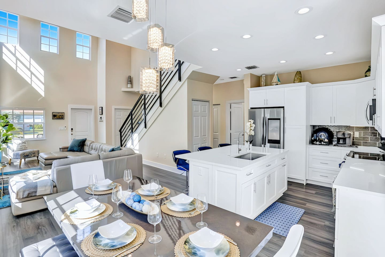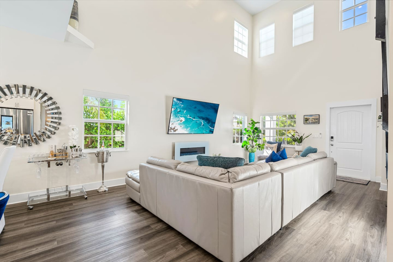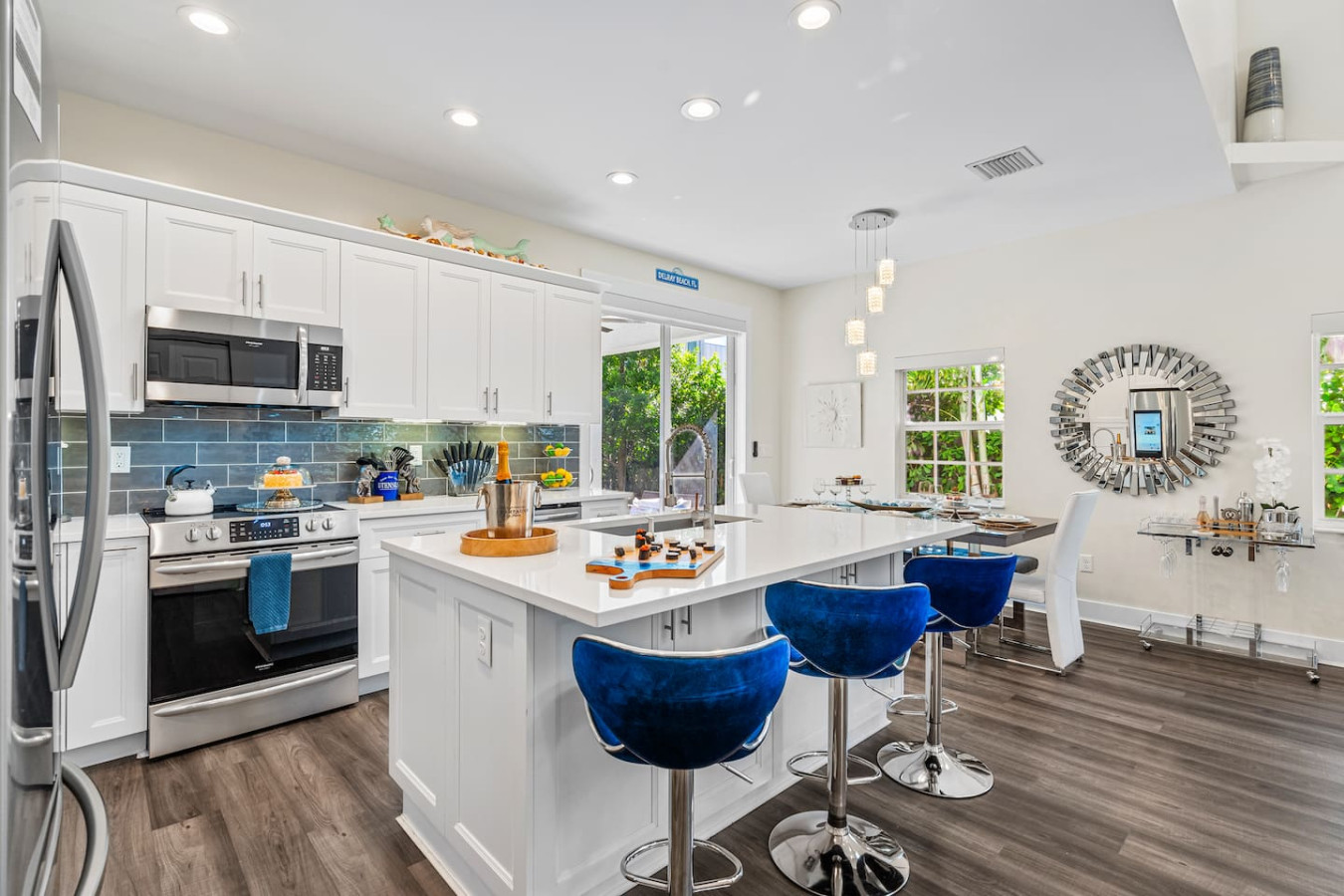 The kitchen is stocked well beyond basics β a smart fridge with a virtual whiteboard, pool towels, beach chairs, personal toiletries, disposable razors, board games, an iron and steamer, and dish and laundry supplies. Multiple guests have noted it's one of the most thoroughly stocked Airbnbs they've stayed in. A fully stocked bar cart with martini and wine glasses is ready when you arrive β something bachelorette and girls trip groups put to use immediately.