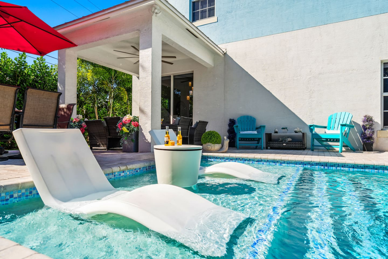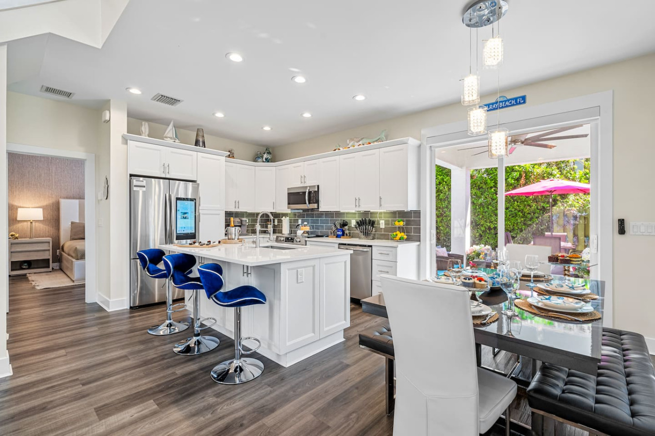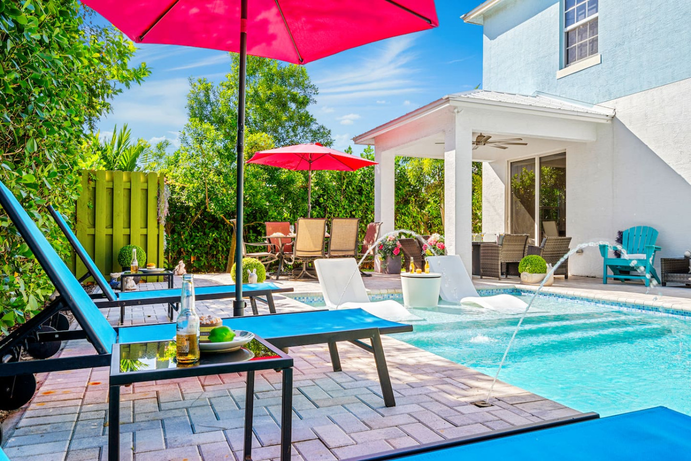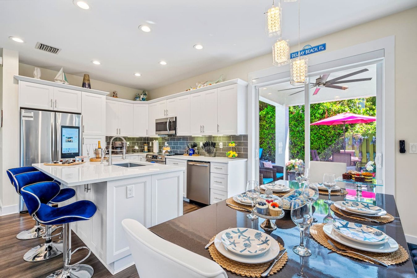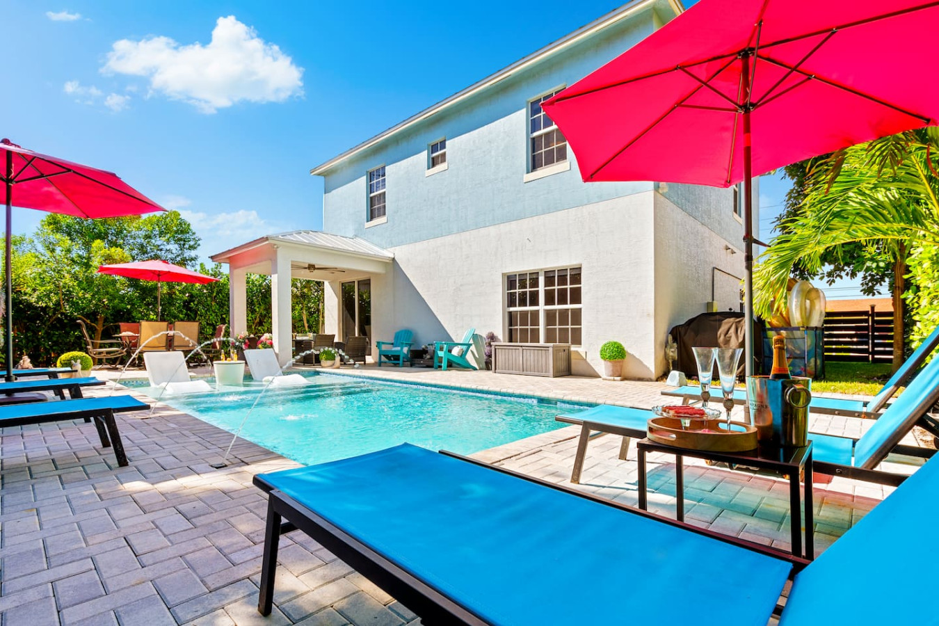 Bachelorette weekends, girls trips, family vacations β this is the house groups keep coming back to. Heated pool with in-water lounge chairs, designer coastal interior, private backyard, and a fully stocked bar cart with martini and wine glasses ready when you arrive. Sleeps 10. Walk to Publix. 5 minutes to Atlantic Ave and the beach.