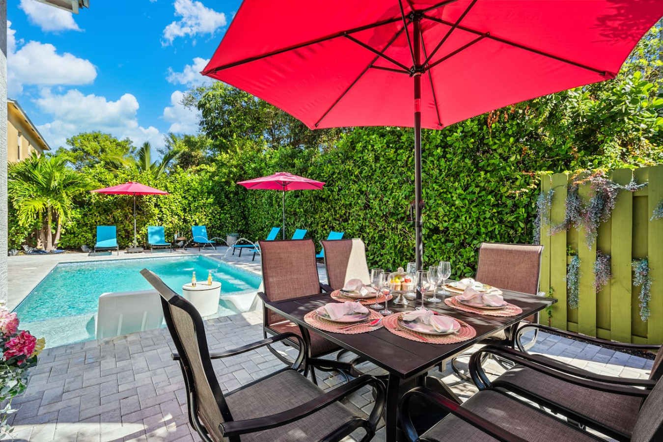 The backyard is fully enclosed and tree-lined, giving you complete visual privacy. One thing worth knowing: the property backs up to a nearby shopping strip, so you may hear the occasional early morning delivery truck. Most guests don't find it disruptive β and several have noted the upside: a Publix, deli, smoothie spot, sushi, and a gym are all a short walk away. Guests without cars have specifically called this out as a reason the location works.