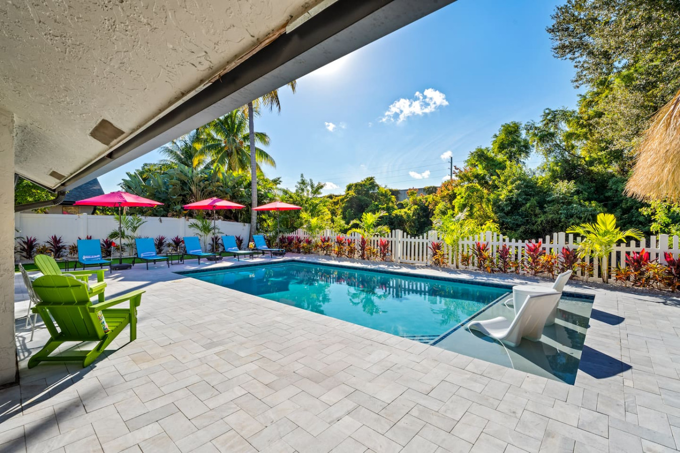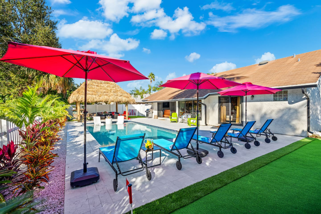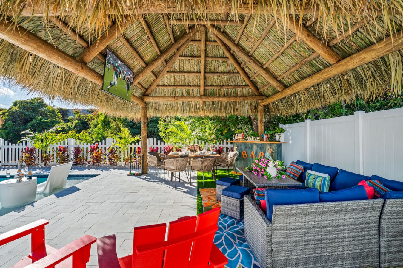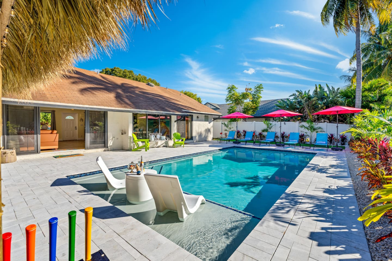 One guest called it "your own personal Margaritaville." Heated pool, tiki hut with bar, seating, dining and smart TV, putting green, cornhole, jumbo Connect Four, and billiards inside. Canal-front backyard. Vaulted ceilings. Sleeps 8. Pet-friendly. 10 minutes to Atlantic Ave. No checkout task list. Bar cart, beach chairs, umbrellas, and coolers included. Perfect for families, bachelorettes, and group getaways. Host responds in minutes. Beach 10 minutes away. Boca Raton 5-10 minutes south.