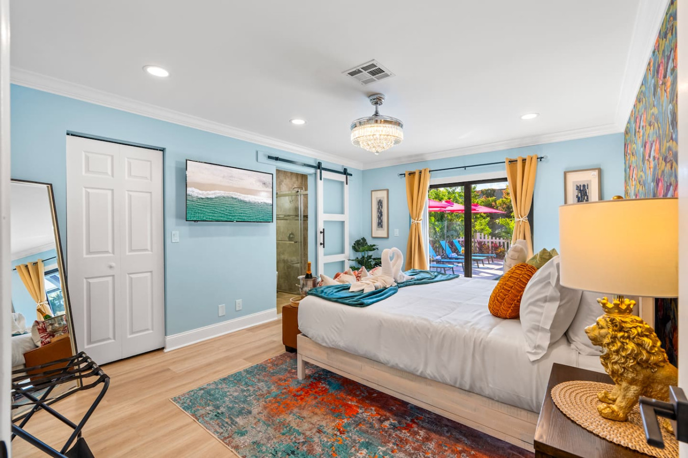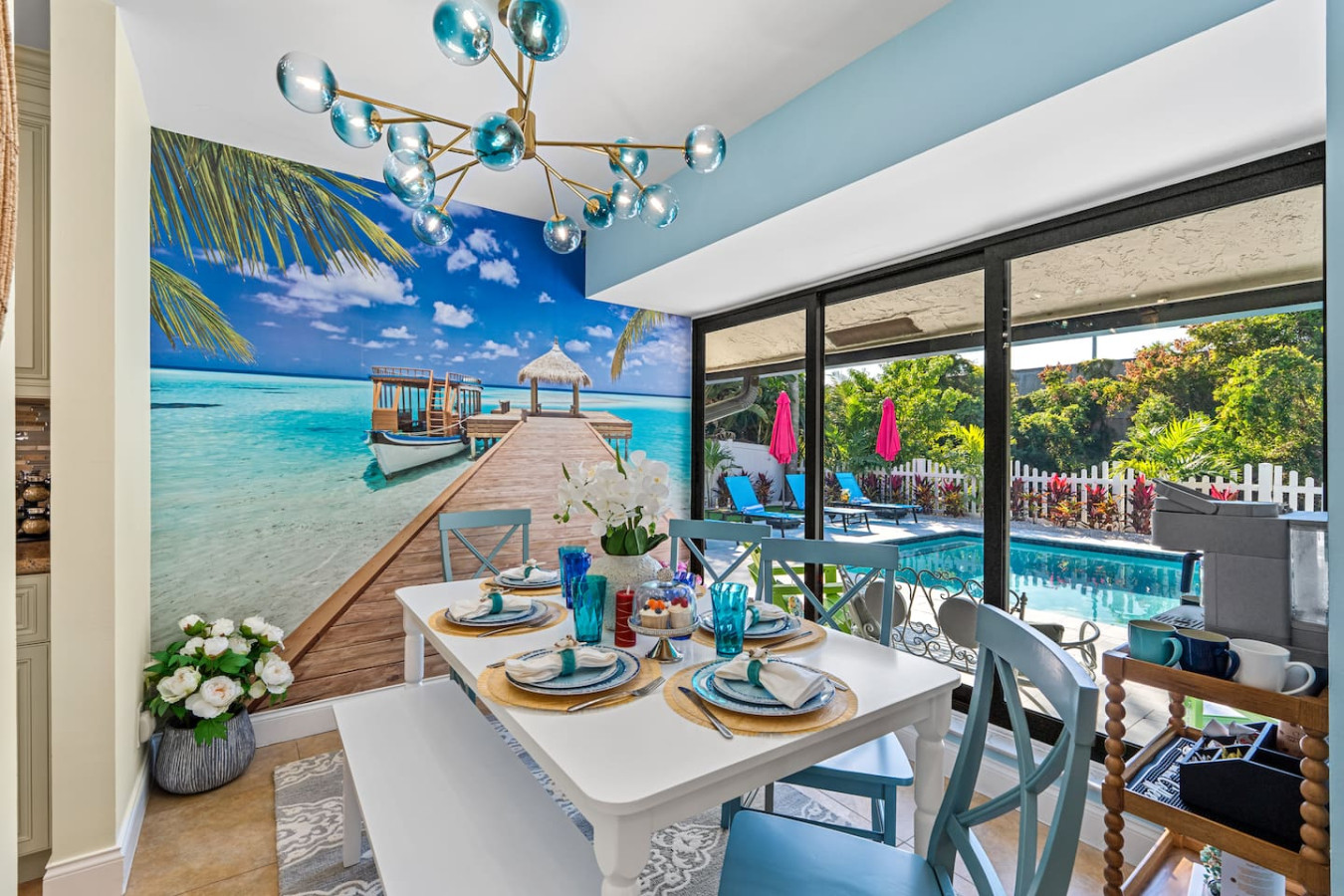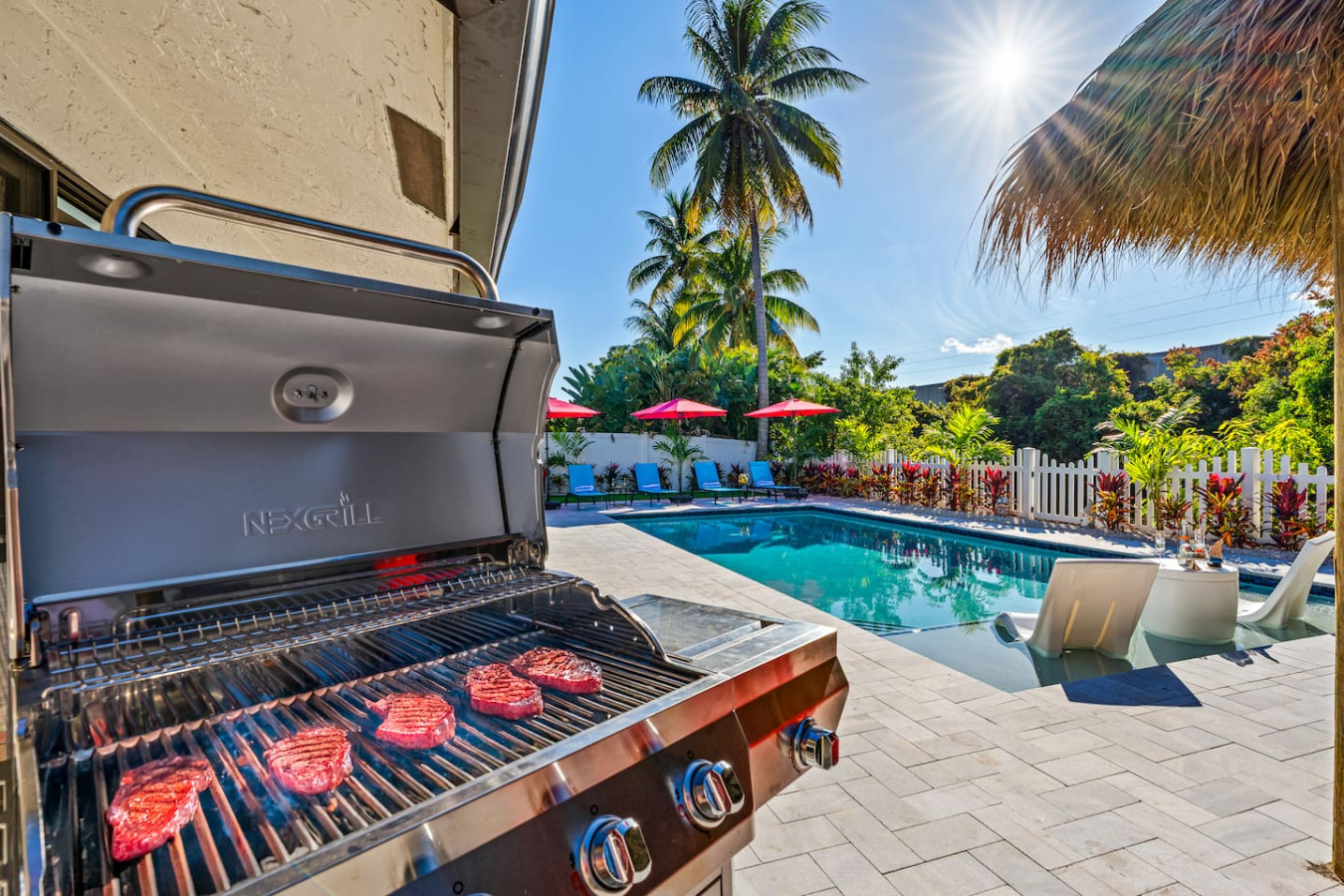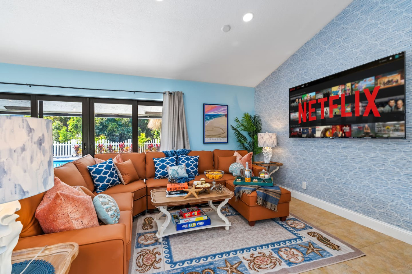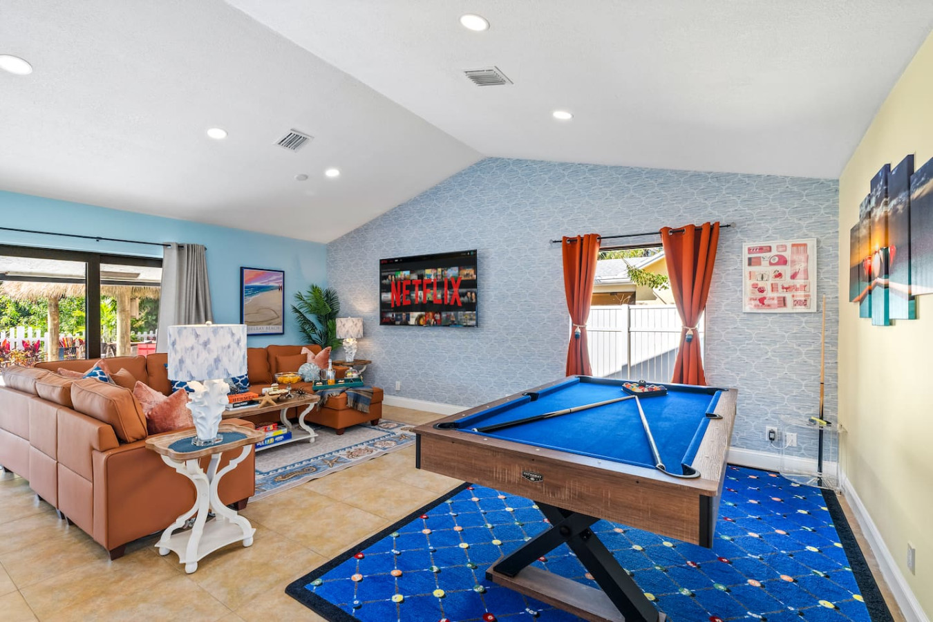 One guest called it "your own personal Margaritaville." Heated pool, tiki hut with bar, seating, dining and smart TV, putting green, cornhole, jumbo Connect Four, and billiards inside. Canal-front backyard. Vaulted ceilings. Sleeps 8. Pet-friendly. 10 minutes to Atlantic Ave. No checkout task list. Bar cart, beach chairs, umbrellas, and coolers included. Perfect for families, bachelorettes, and group getaways. Host responds in minutes. Beach 10 minutes away. Boca Raton 5-10 minutes south.