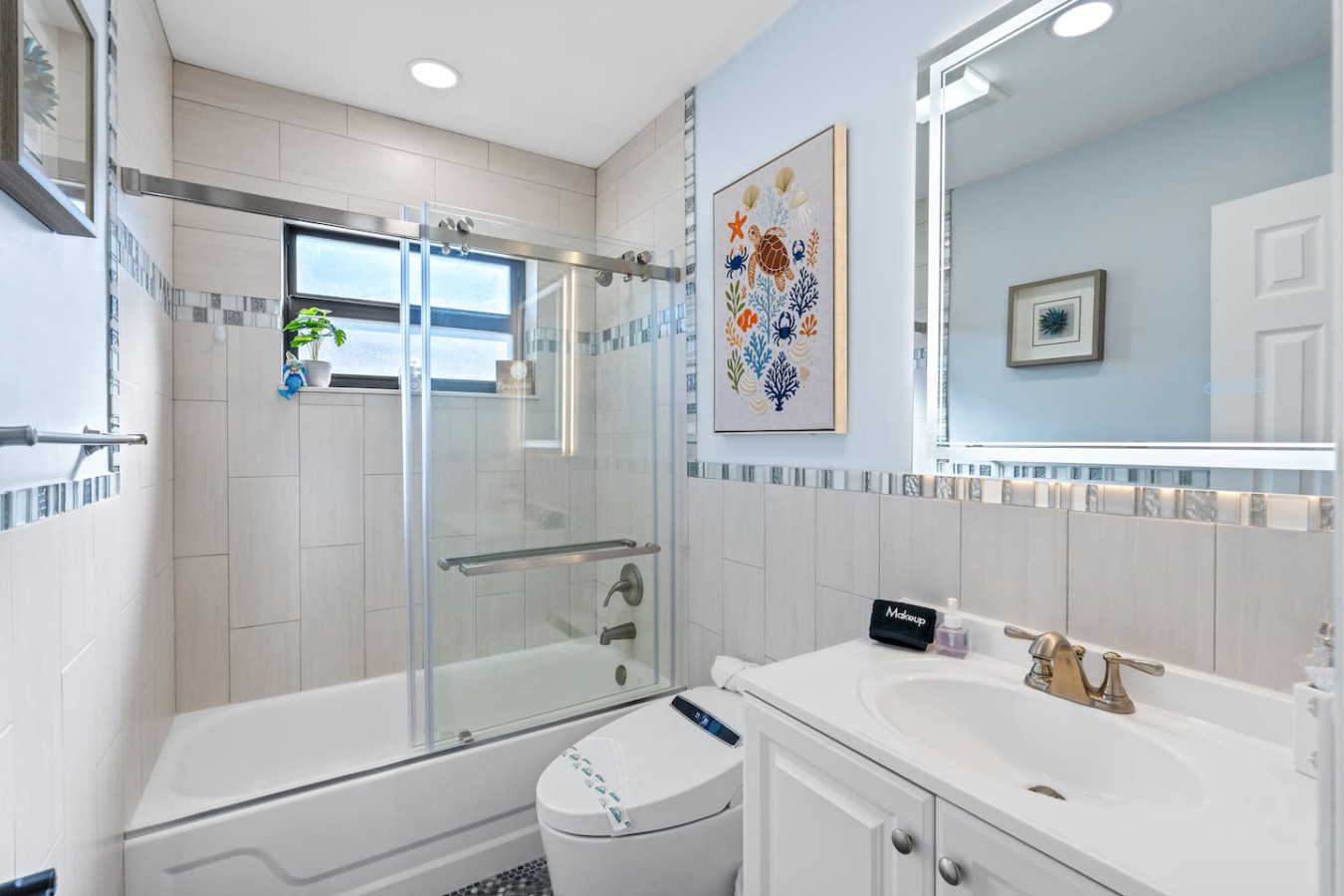 Both bathrooms are fully updated with smart bidet toilets β walk-in shower in one, bathtub and shower combination in the other. Lighted vanity mirrors throughout.