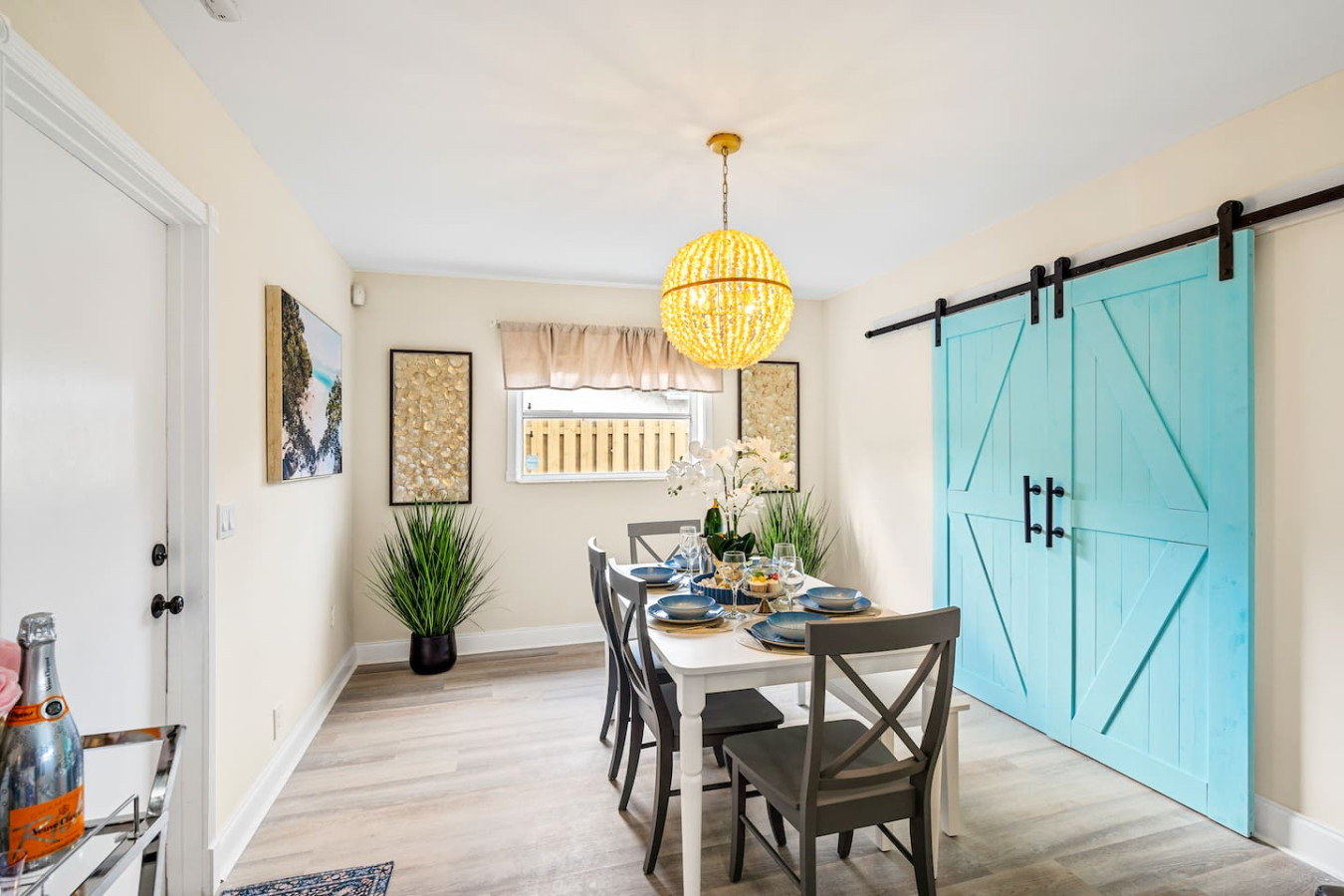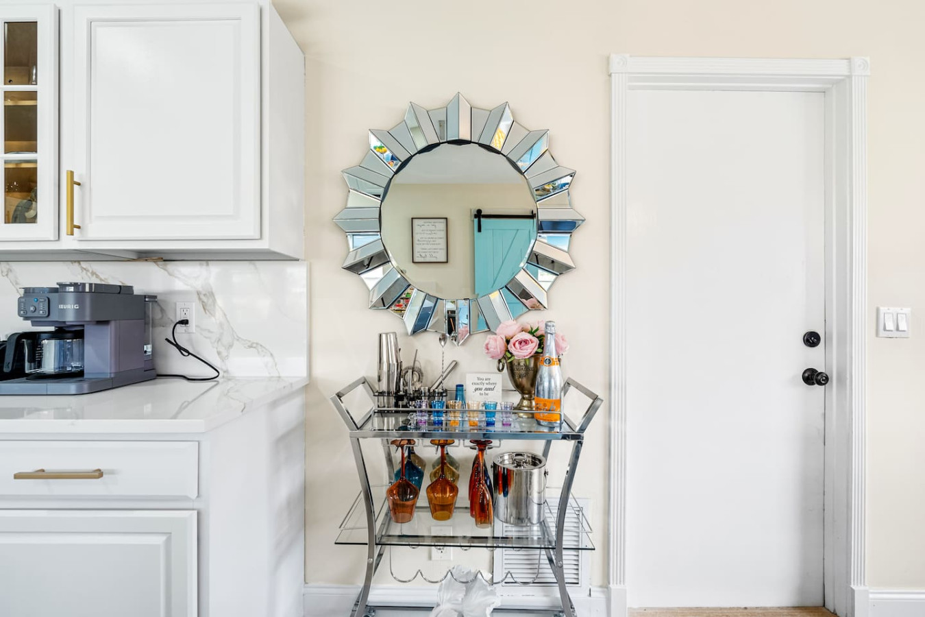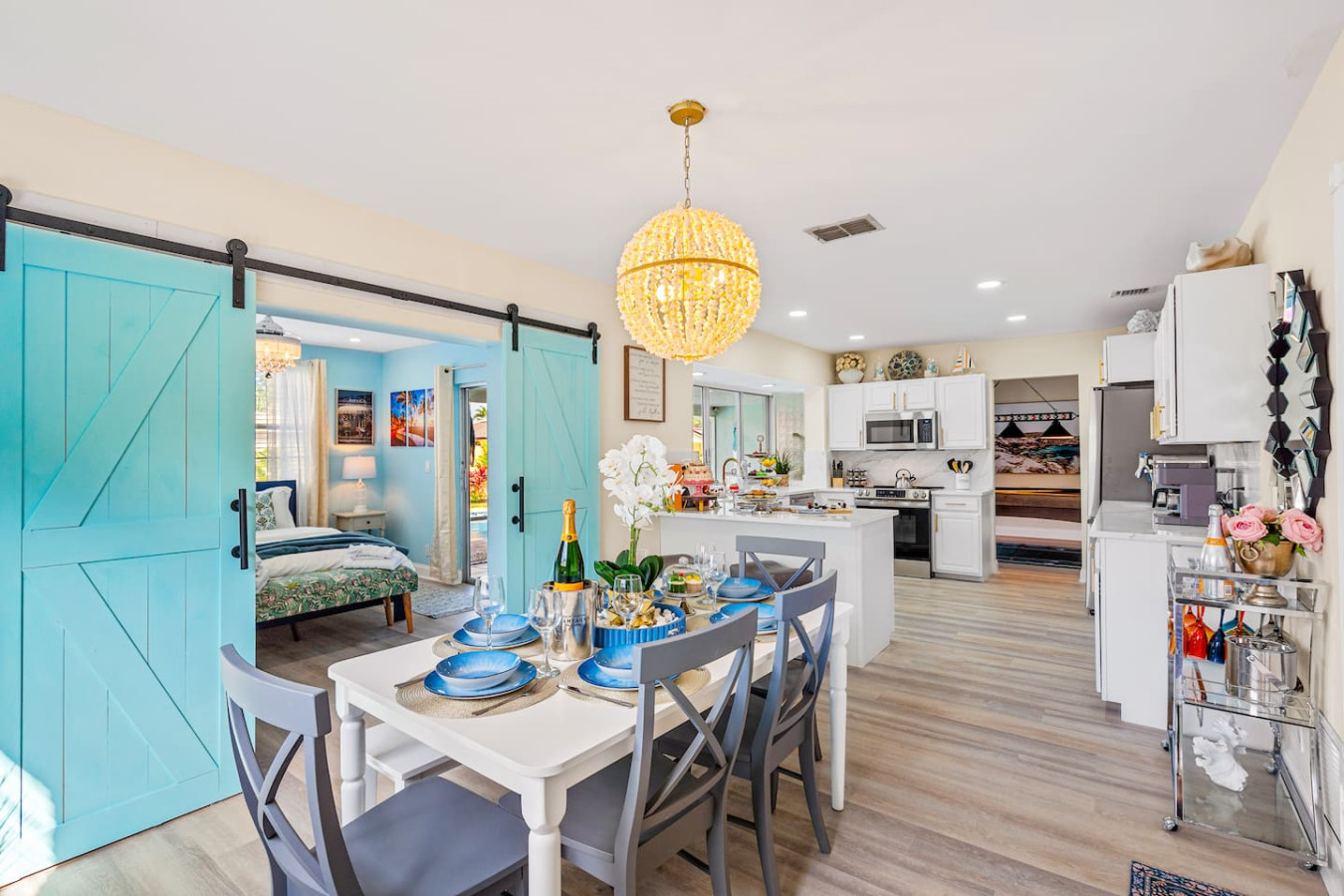 Beach chairs, umbrellas, and coolers are included. A fully stocked bar cart with martini and wine glasses is ready when you arrive.