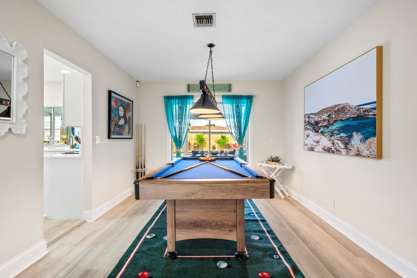 The billiards table and 65" Smart TV anchor the living space. Pool table tournaments have run for multiple evenings at this property. The kitchen is fully stocked โ quality cookware, coffee setup, dining table, and everything a large group needs for full meals. Children's amenities are available โ travel crib, high chair, and kid-friendly dinnerware.