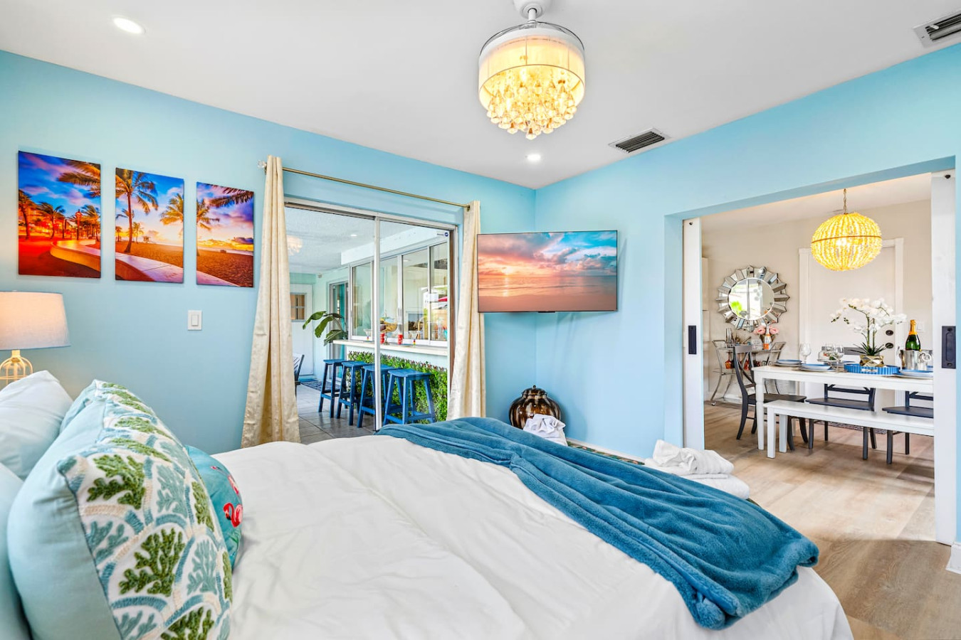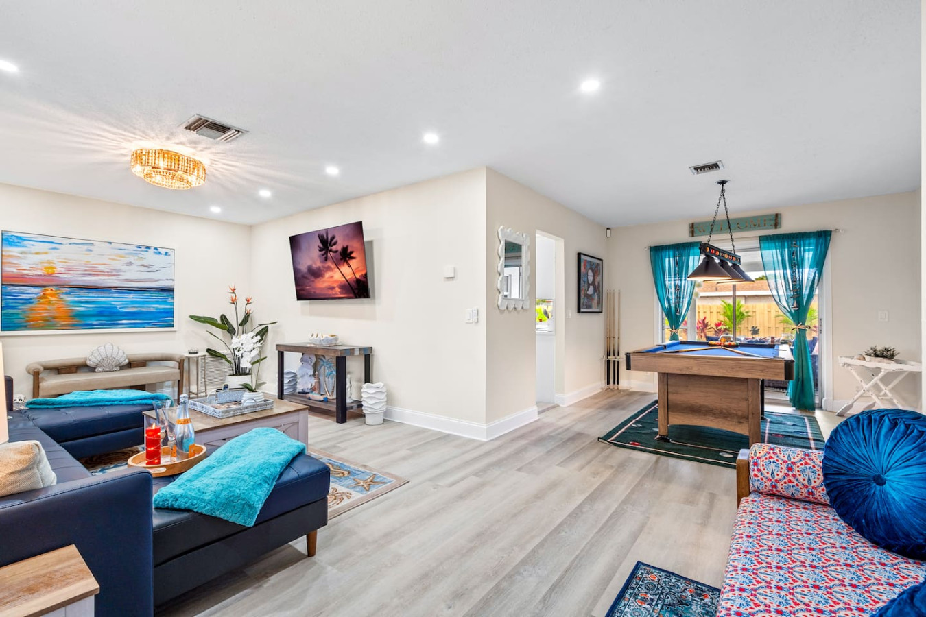 One guest said the bathrooms feel like time traveling into the future โ fog-free smart mirrors, toilets that warm up and greet you when you approach. "Like something out of Star Trek," he wrote. Heated pool, screened lanai with ping pong and dining, billiards, Caloosa Park 1 block away. Sleeps 10. Pet-friendly. 15 minutes to Atlantic Ave. No checkout tasks. Bar cart, beach chairs, umbrellas, and coolers included. Perfect for families, golf groups, and group getaways. Host responds in minutes.