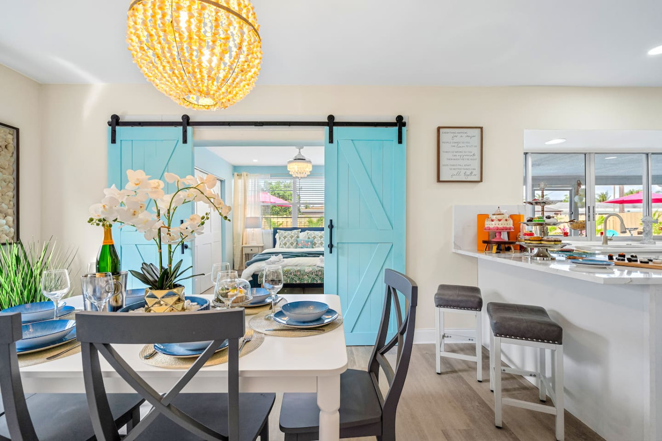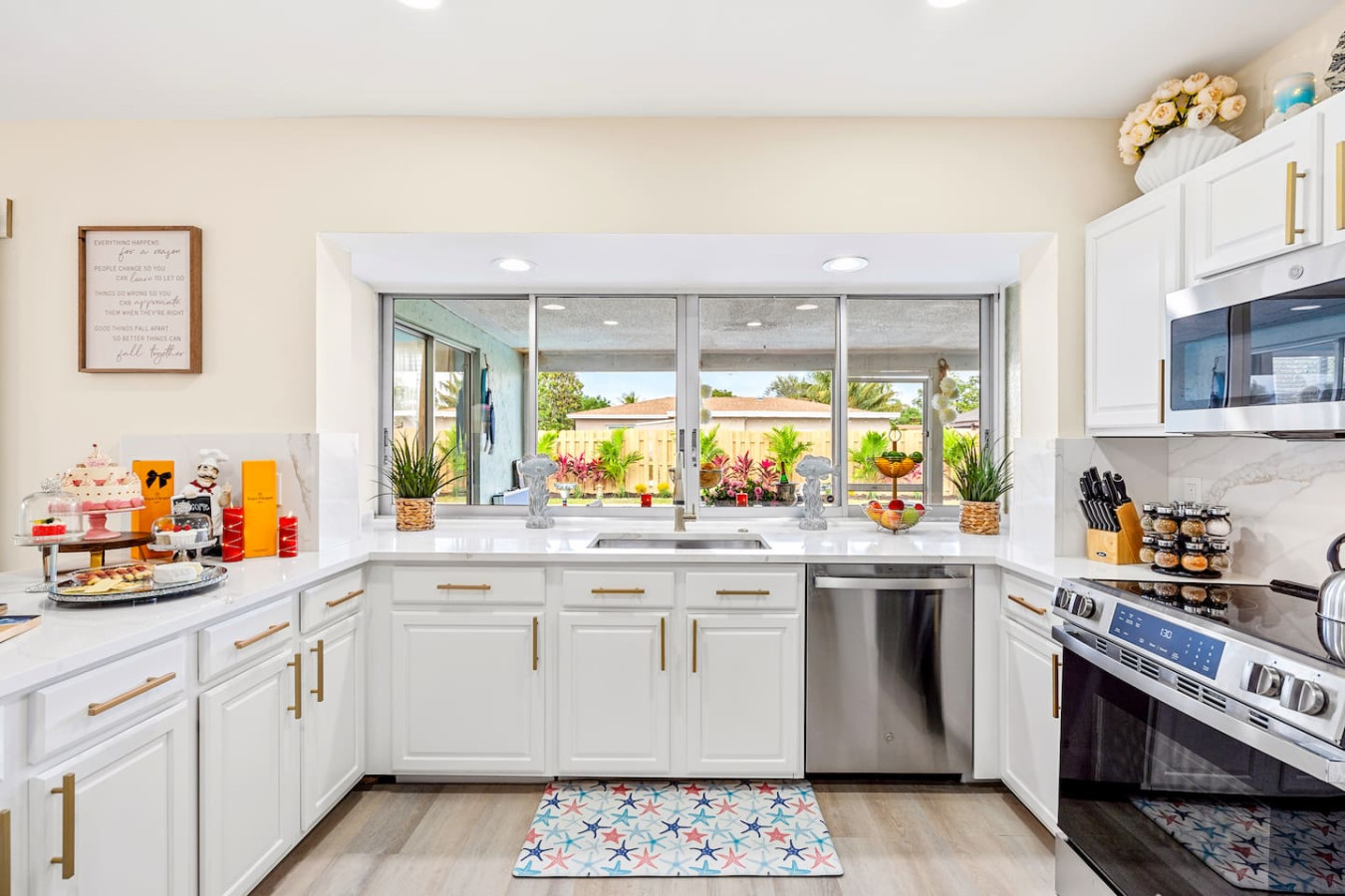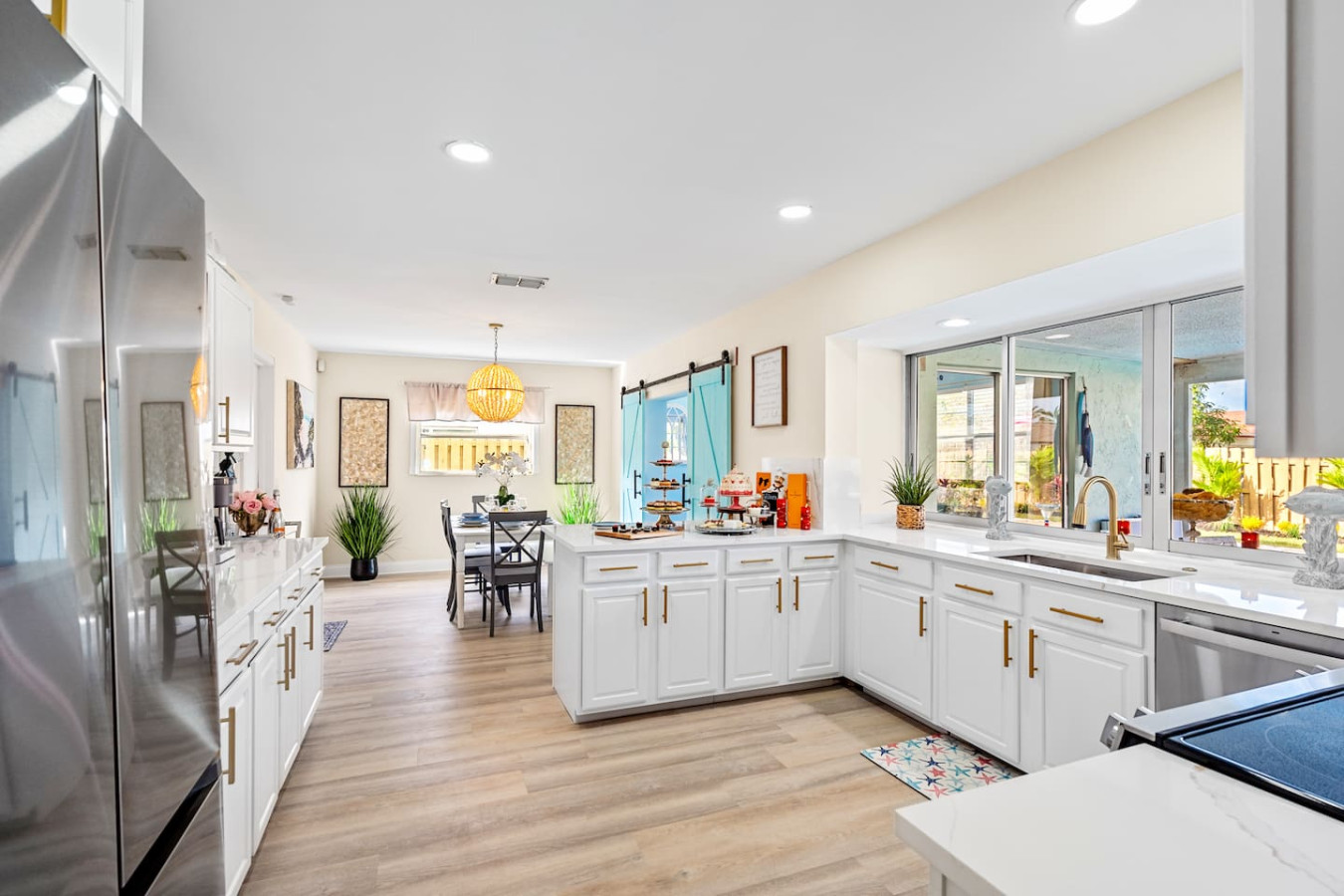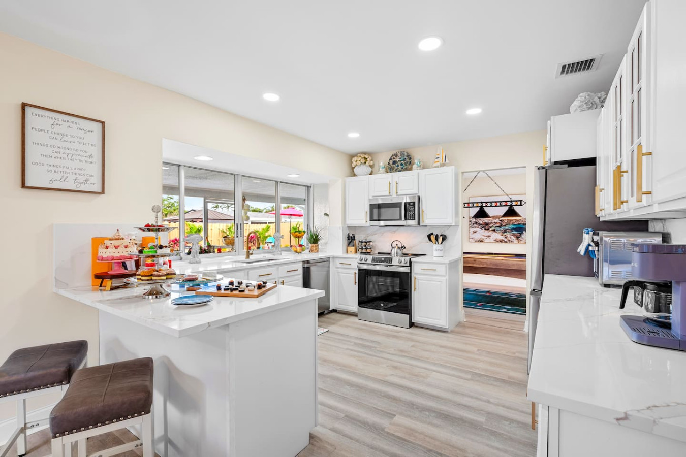 The interior looks โ in one guest's words โ as if it was remodeled the day before you arrived. Super modern throughout, quality finishes in every room, and a layout that keeps the group connected without crowding anyone. The open-concept kitchen and living area flow directly to the screened lanai.