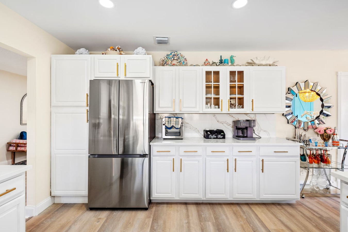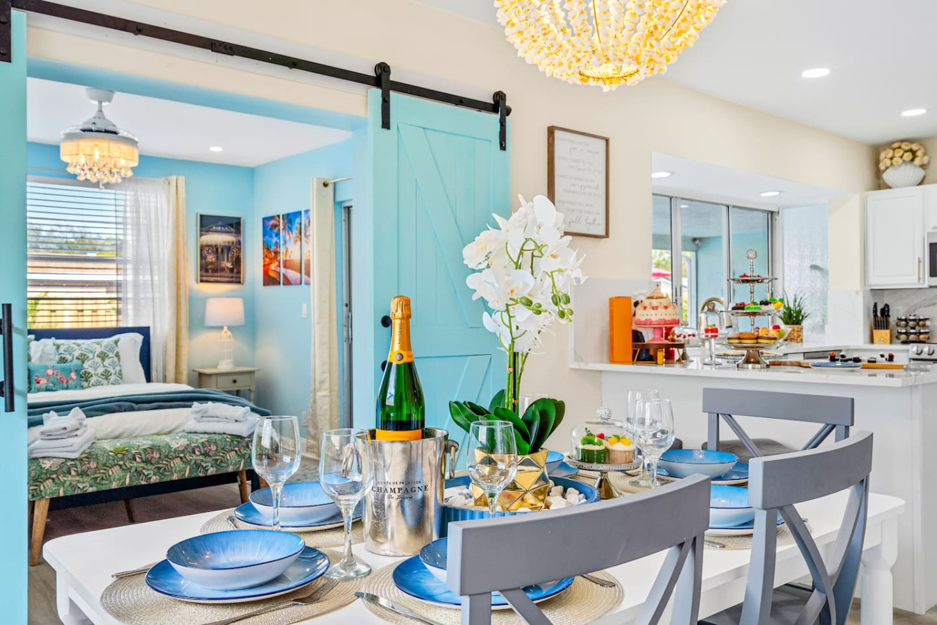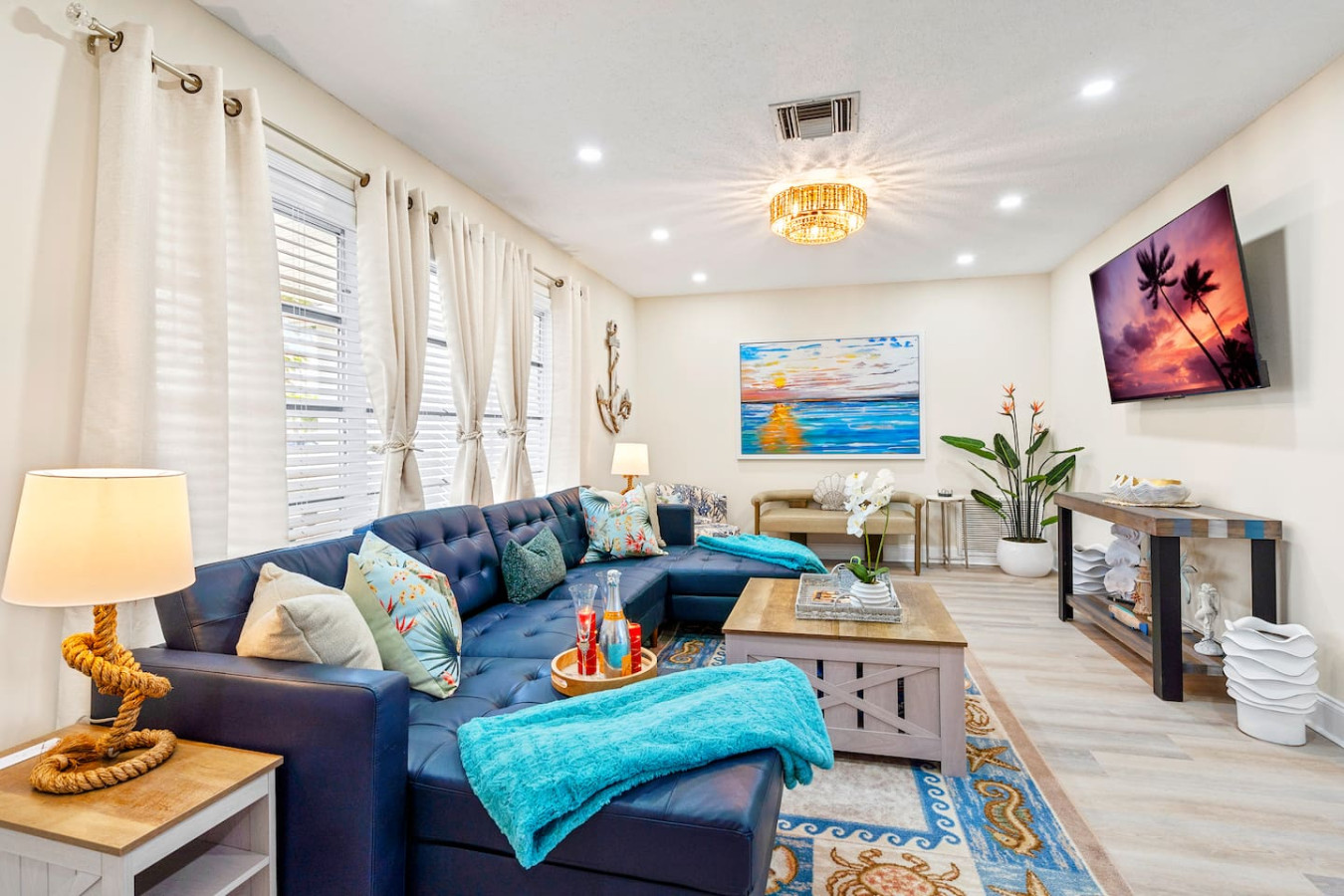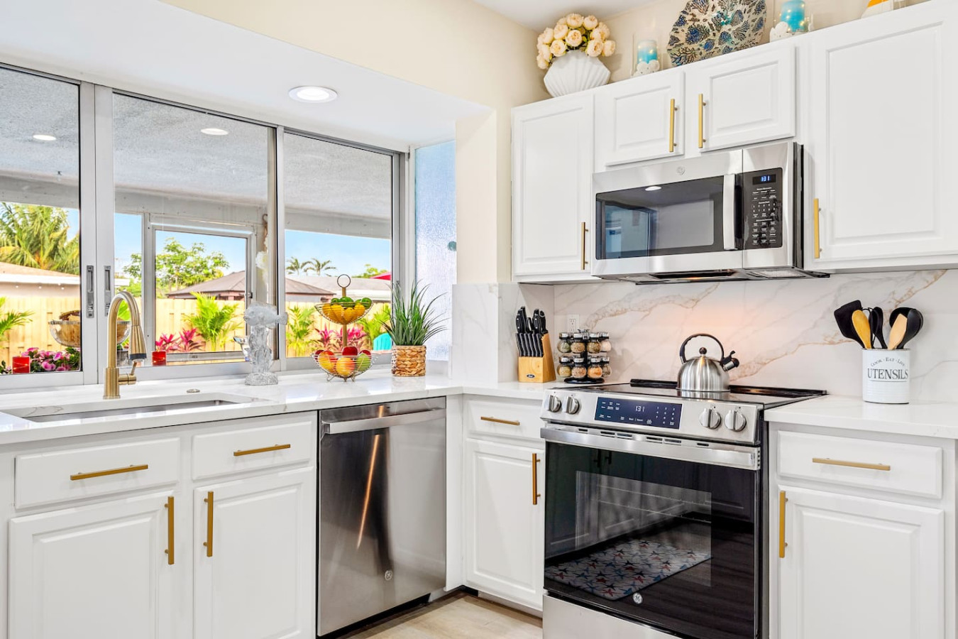 The interior looks โ in one guest's words โ as if it was remodeled the day before you arrived. Super modern throughout, quality finishes in every room, and a layout that keeps the group connected without crowding anyone. The open-concept kitchen and living area flow directly to the screened lanai.