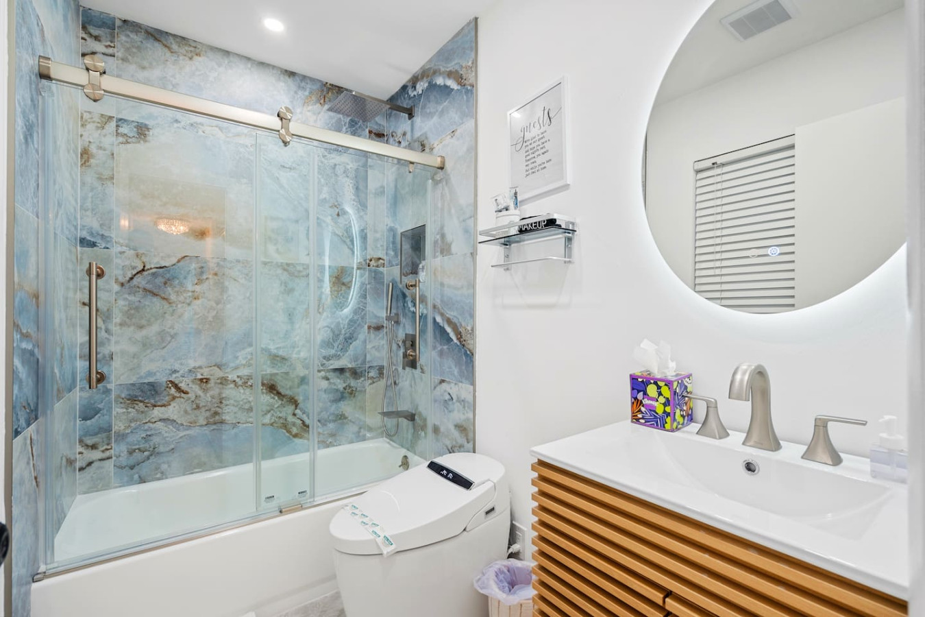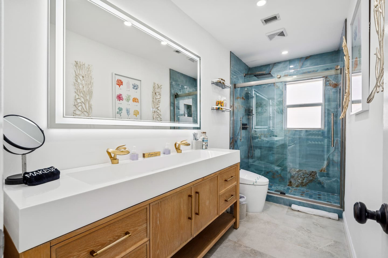 Now โ the bathrooms. Both are fully updated with fog-free LED smart mirrors and high-tech smart bidet toilets that warm up and are motion-activated. One has a walk-in shower, the other a bathtub and shower combination. Fresh towels, hair dryer, and essential toiletries stocked throughout. Guests have called them the highlight of the stay, a little slice of luxury, and โ most accurately โ something out of Star Trek.