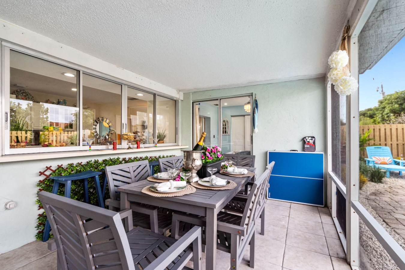 The screened lanai is a distinct outdoor living room that connects directly to the kitchen through a window โ a detail multiple guests specifically called out as a hit for keeping the group connected whether they're cooking or eating outside. The lanai has a dining table for eight, lounge seating, ping pong, and string lights for evening ambiance.